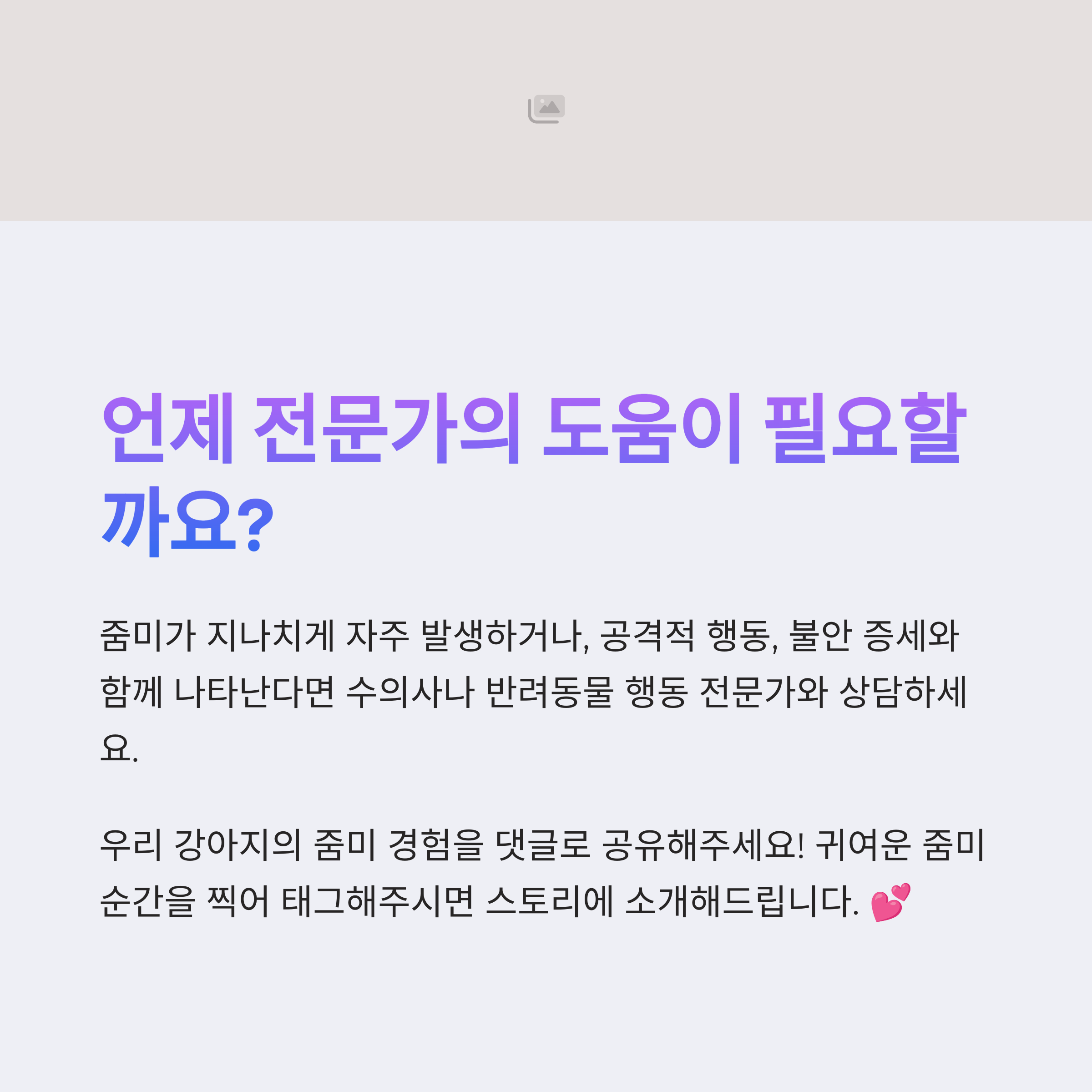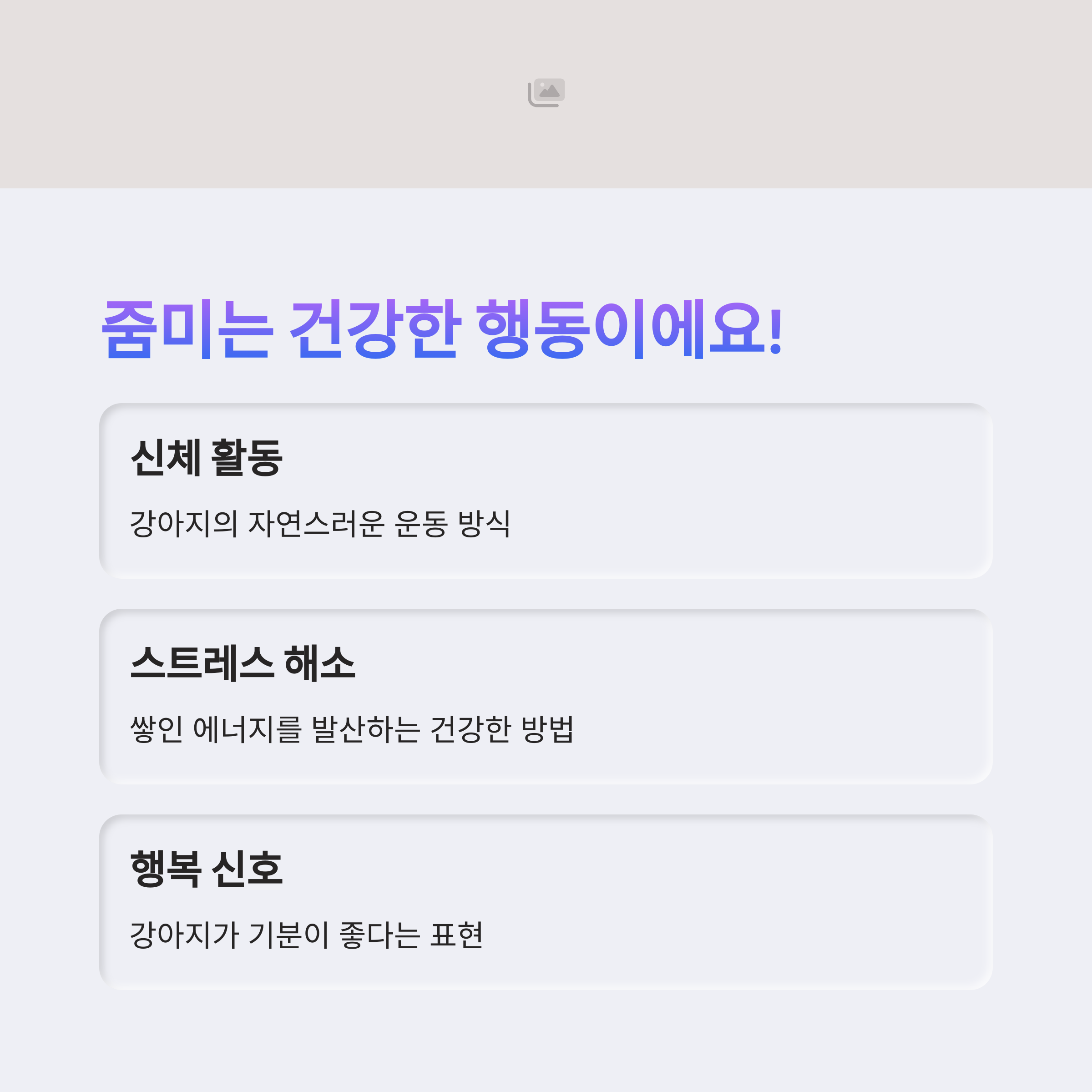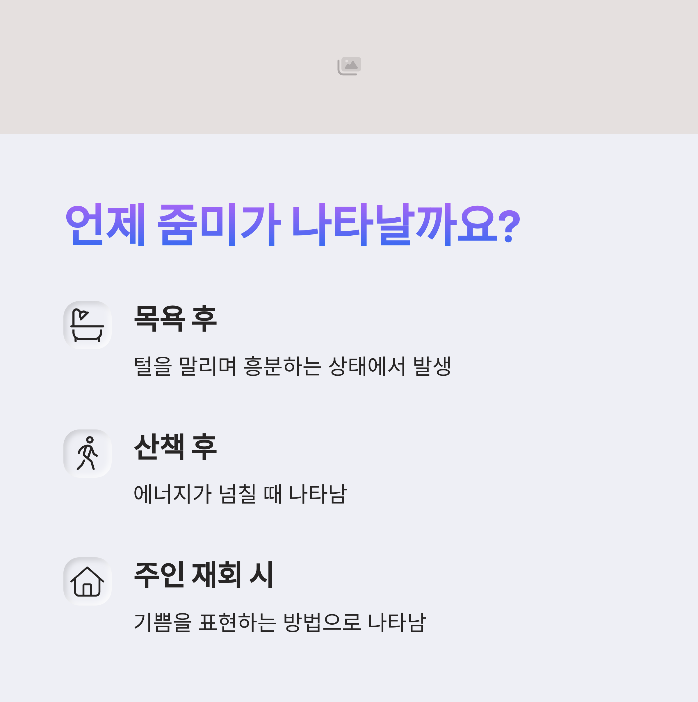 | 줌미(ZOOMIES)란? | 강아지가 갑자기 폭주하듯 뛰는 본능적 행동입니다. |
