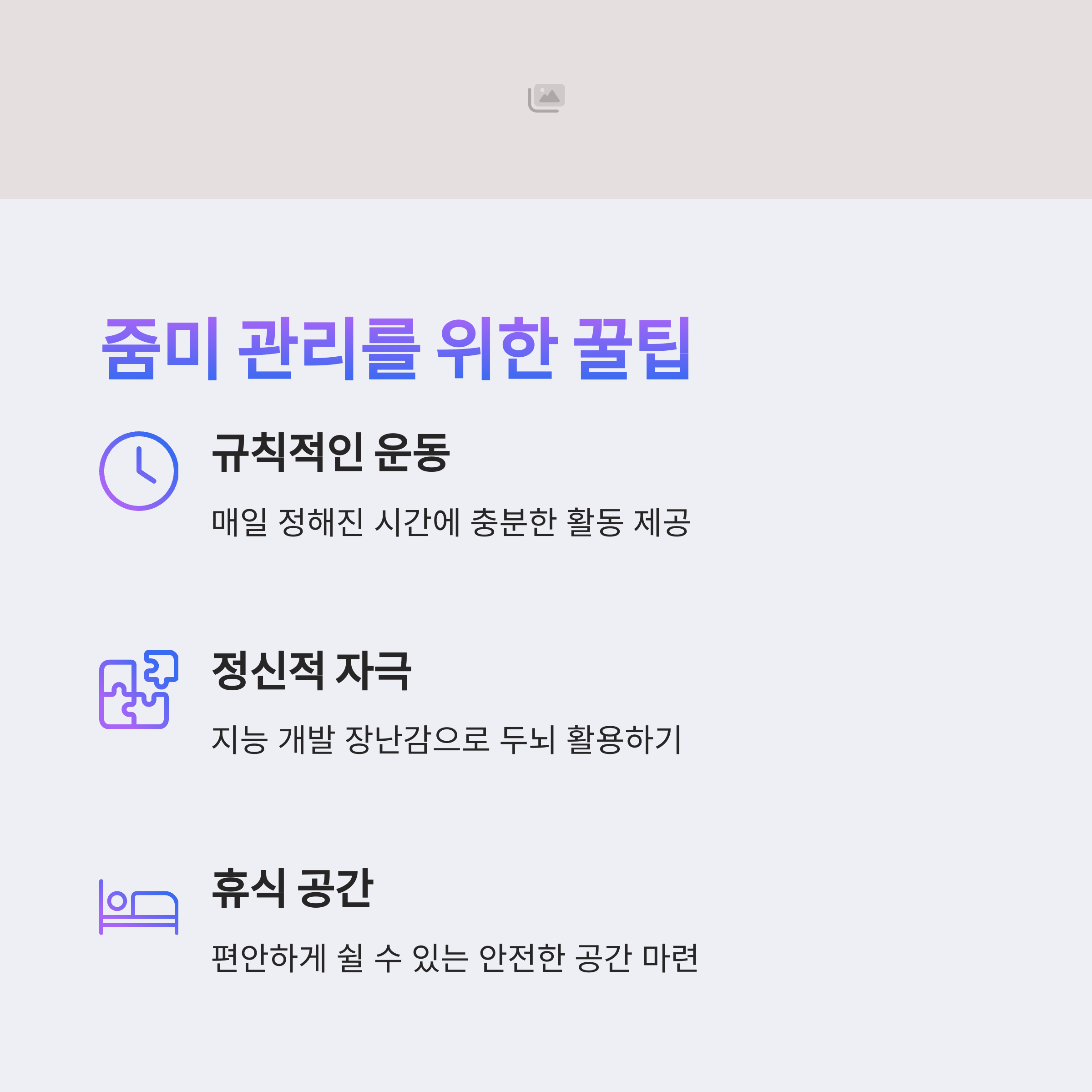 줌미는 대부분 정상적인 행동으로 간주되며, 보호자가 특별히 통제할 필요는 없습니다. 다만 위험 요소가 있는 공간에서는 가구나 날카로운 물체에 부딪힐 수 있으니 미리 안전한 공간을 확보해주는 것이 좋습니다. 줌미를 방지하려고 억지로 멈추게 하는 것은 오히려 스트레스를 유발할 수 있으므로 피하는 것이 바람직합니다. 대신 평소 충분한 산책과 놀이 시간을 통해 강아지의 에너지를 미리 분산시켜 주면, 갑작스러운 폭주 행동도 줄어들 수 있습니다.