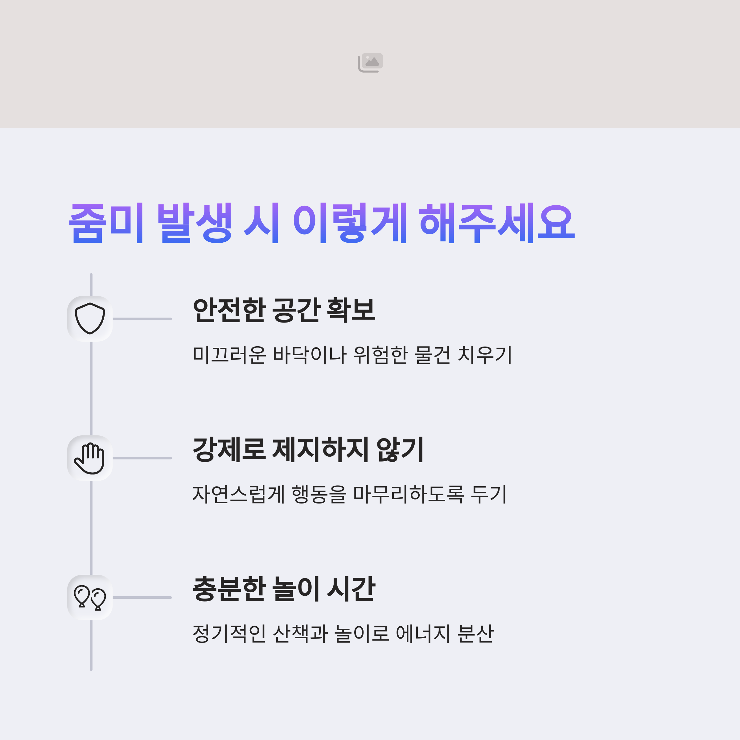 줌미는 대부분 정상적인 행동으로 간주되며, 보호자가 특별히 통제할 필요는 없습니다. 다만 위험 요소가 있는 공간에서는 가구나 날카로운 물체에 부딪힐 수 있으니 미리 안전한 공간을 확보해주는 것이 좋습니다. 줌미를 방지하려고 억지로 멈추게 하는 것은 오히려 스트레스를 유발할 수 있으므로 피하는 것이 바람직합니다. 대신 평소 충분한 산책과 놀이 시간을 통해 강아지의 에너지를 미리 분산시켜 주면, 갑작스러운 폭주 행동도 줄어들 수 있습니다.