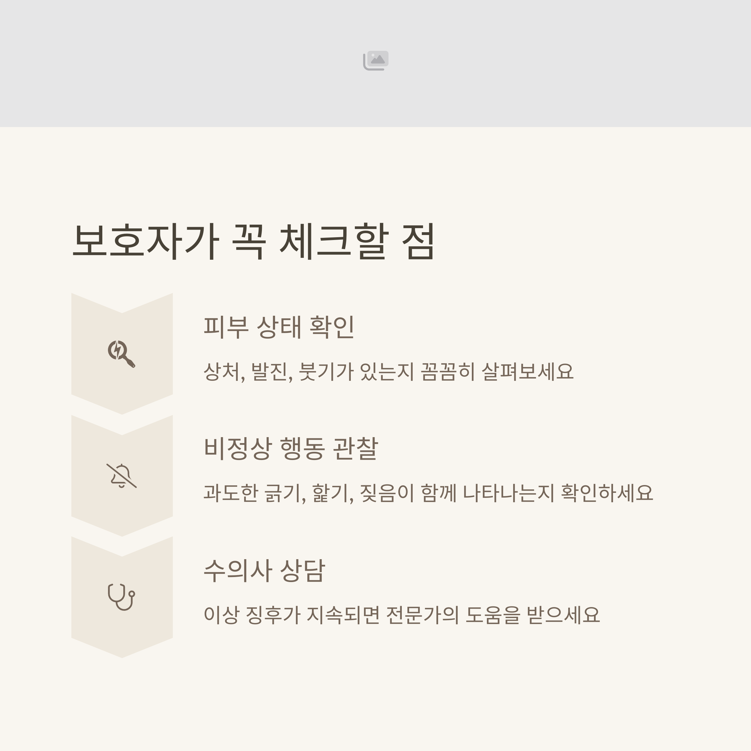 긁거나 몸을 자주 문지르고, 탈모, 발적, 상처가 보이면 바로 병원 진료를 권장합니다. 빠른 대응이 건강을 지키는 지름길입니다.