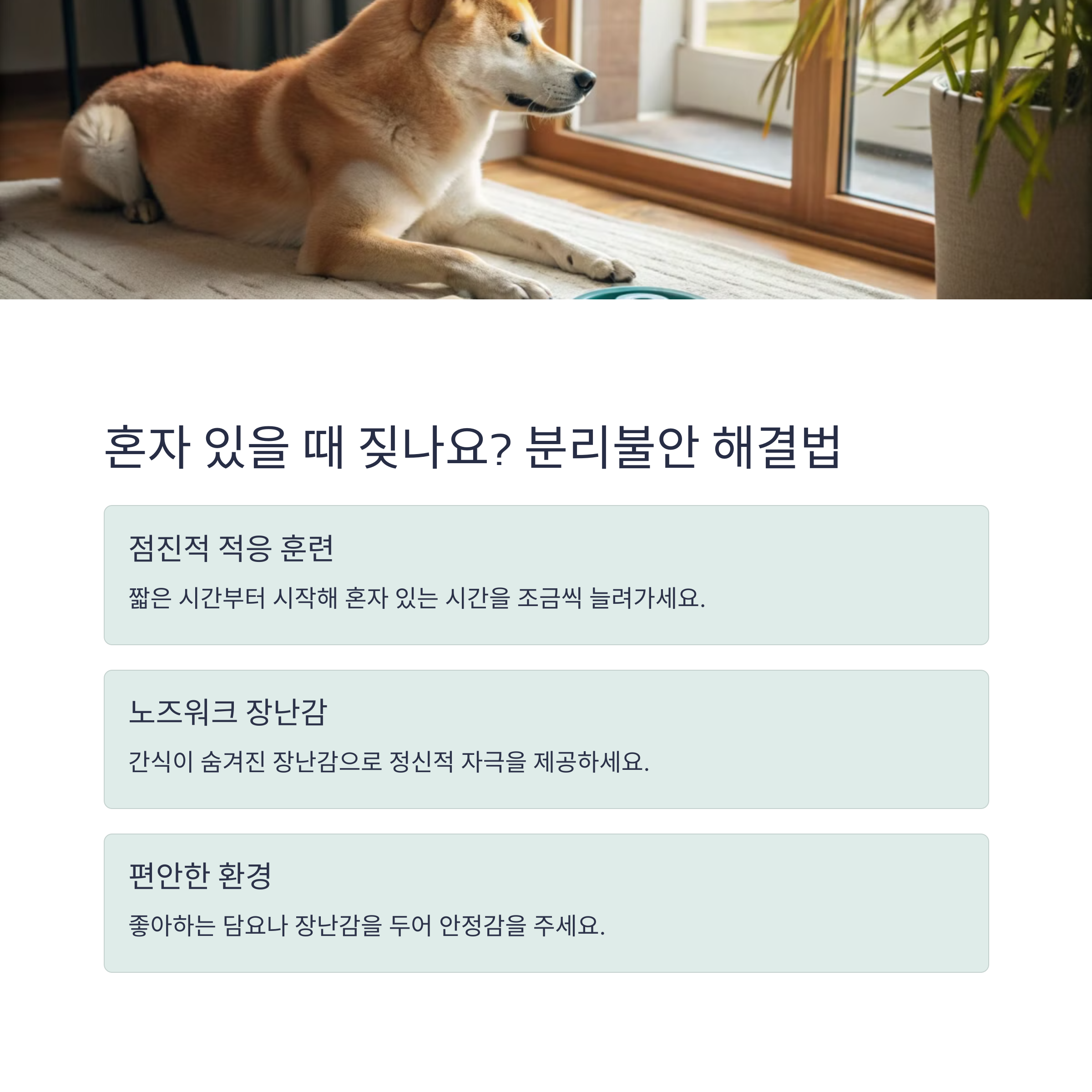 분리불안이 원인일 수 있습니다. 강아지가 혼자 있는 것에 익숙해지도록 점진적인 훈련이 필요합니다. 짧은 시간 동안 혼자 두고, 차츰 시간을 늘리며 장난감이나 노즈워크를 제공하여 스트레스를 줄이는 것이 효과적입니다.