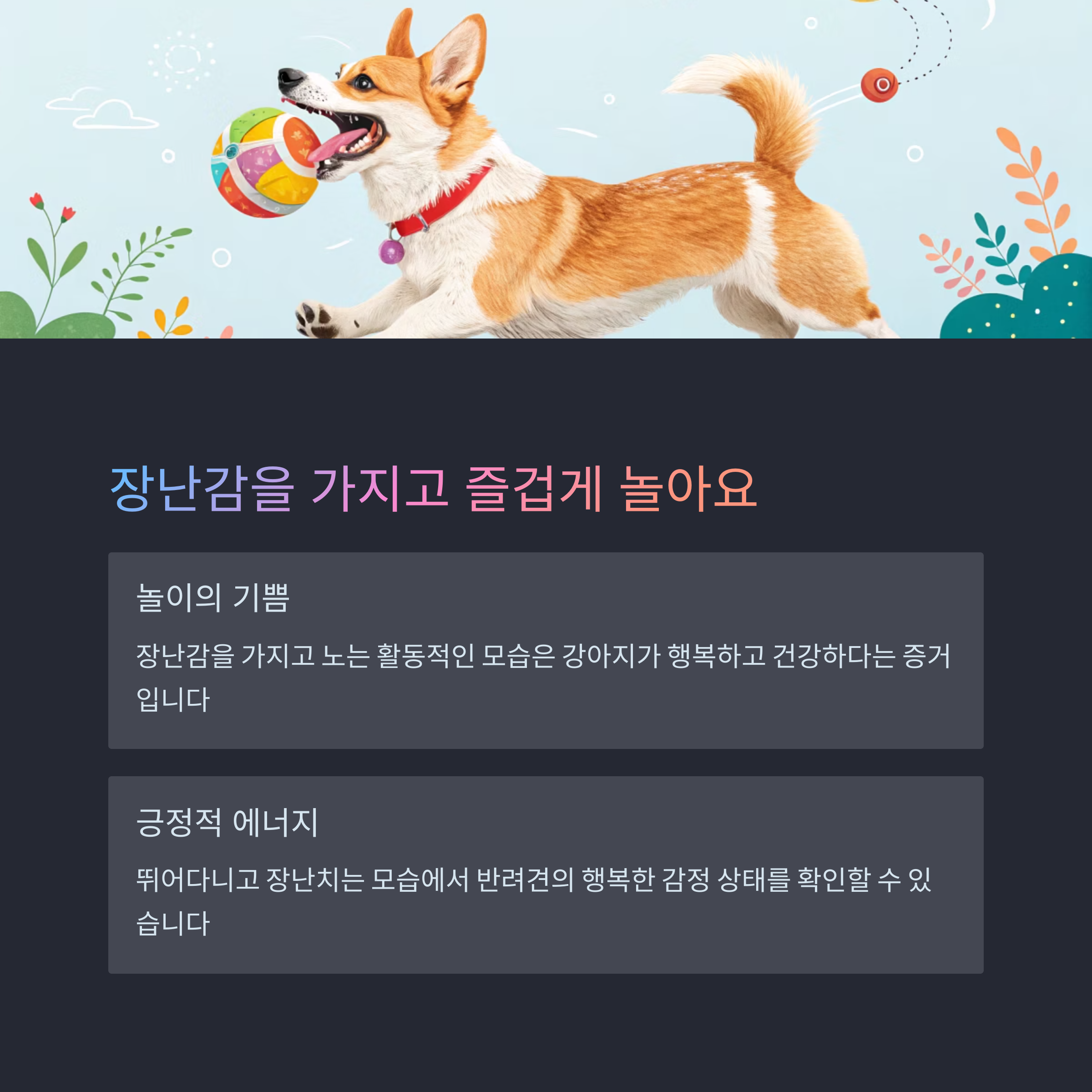 | 감정을 그대로 표현하는 자연스러운 몸짓입니다. | 기분이 좋을 때 즐겁게 장난감을 가지고 놉니다. | 깊은 신뢰를 바탕으로 주인을 응시합니다. |