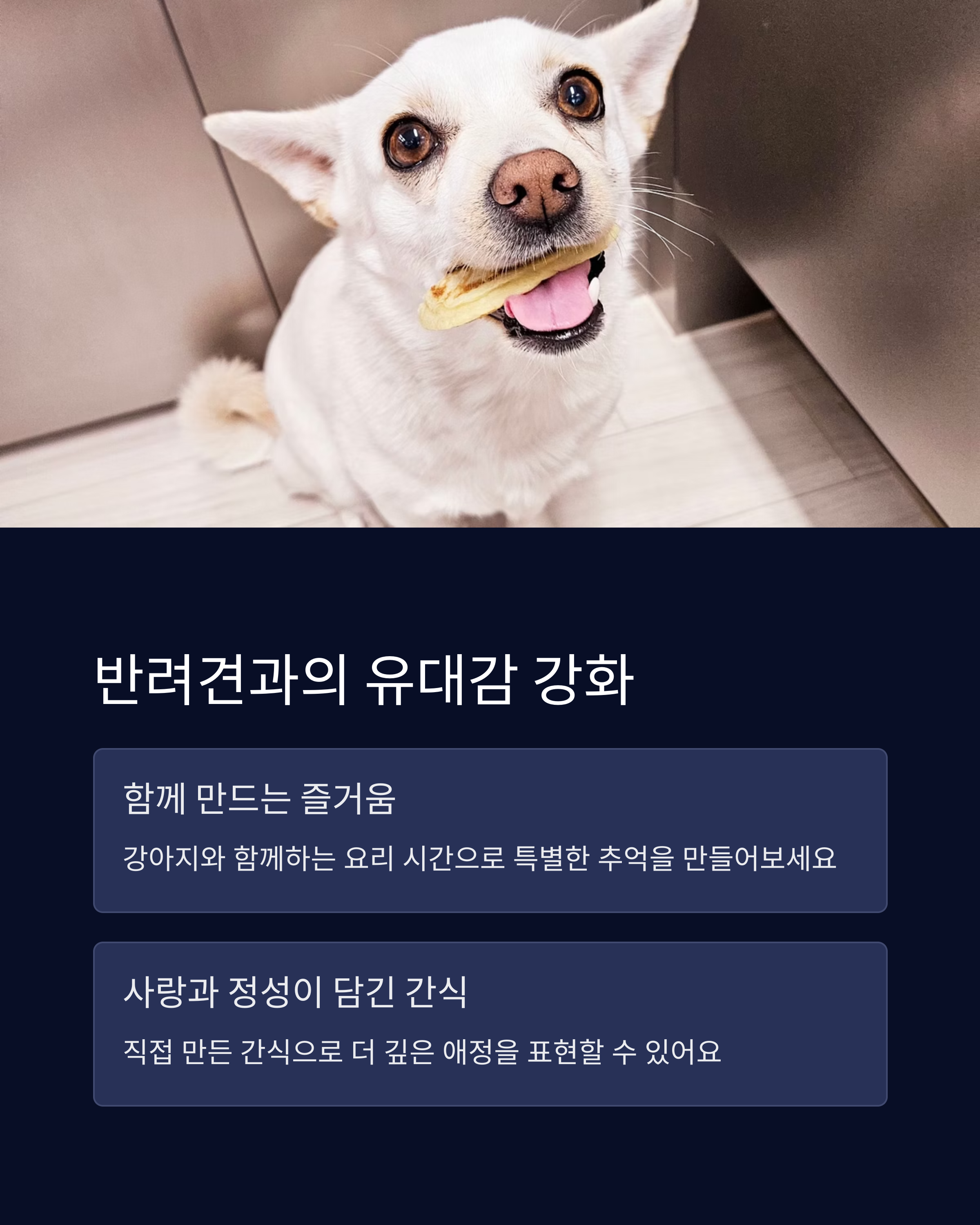 | 수제 간식 장점 | 원재료 확인 가능, 알레르기 예방에 효과적 |