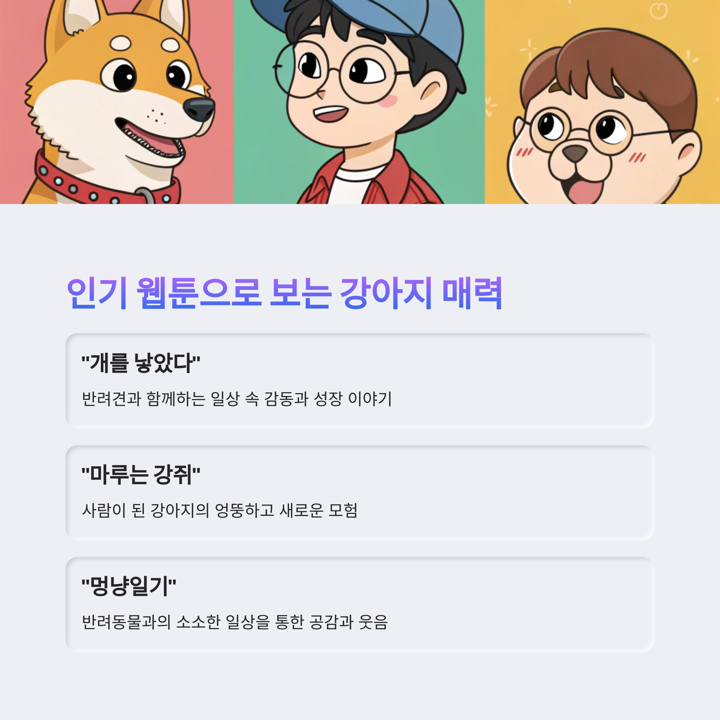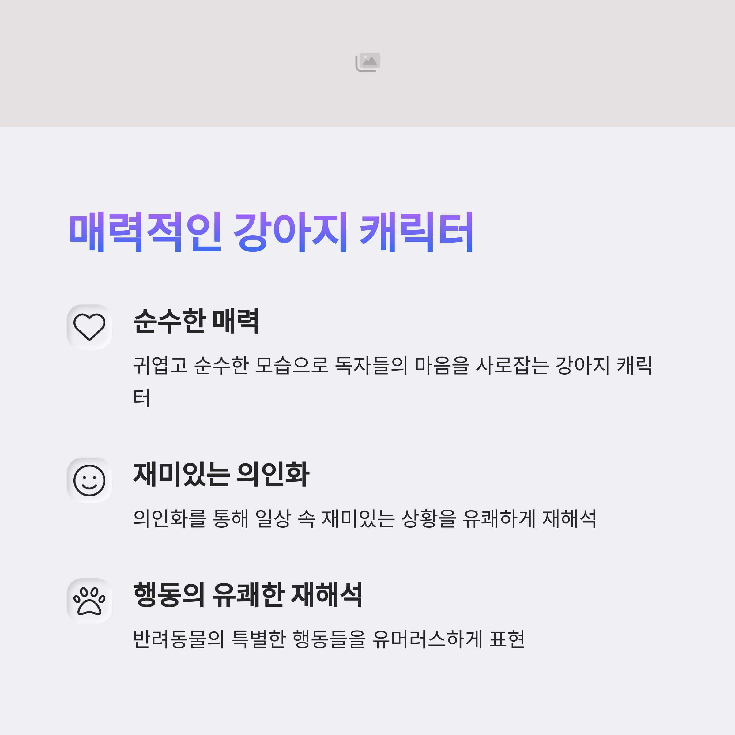 | 강아지 웹툰 인기 | 감동적인 이야기 | 코믹 요소 |