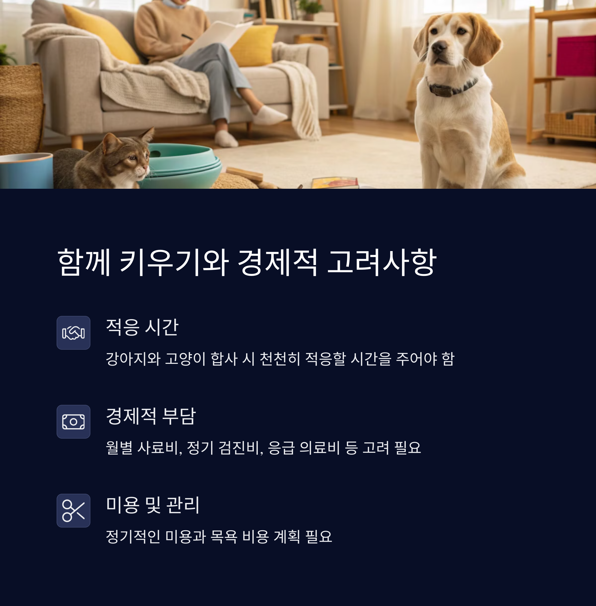 강아지는 **사료, 간식, 미용, 병원비, 장난감** 등으로 월 평균 10~30만 원 정도의 비용이 들 수 있습니다. 고양이도 비슷하지만, **사료와 화장실 모래 비용**이 추가되며 종종 예상치 못한 병원비가 발생할 수도 있습니다.