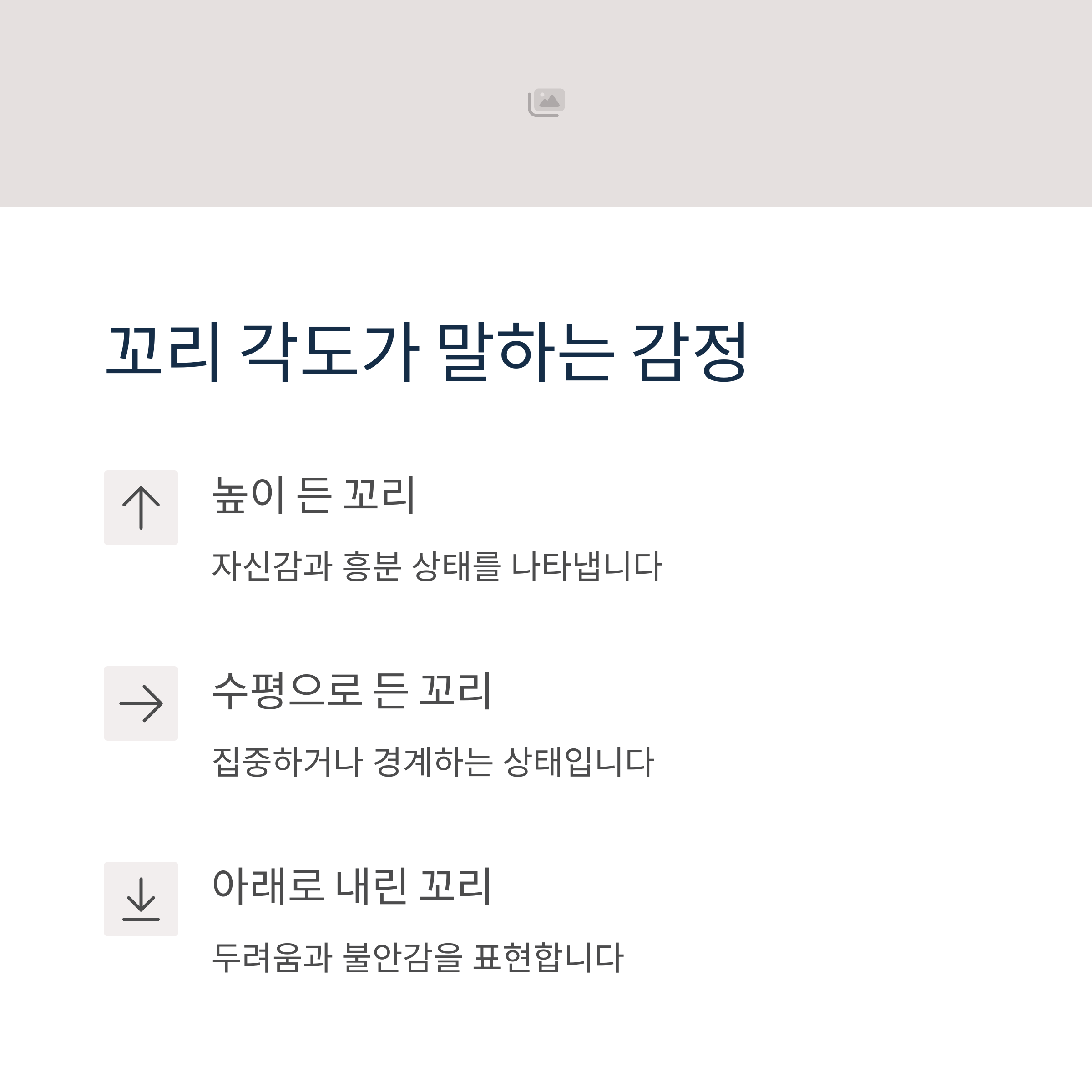| 흔들기의 방향, 속도에 따라 감정이 다릅니다 | 위로 높이면 자신감, 아래로 내리면 불안감 | 꼬리뿐 아니라 표정과 자세도 함께 파악해야 함 |