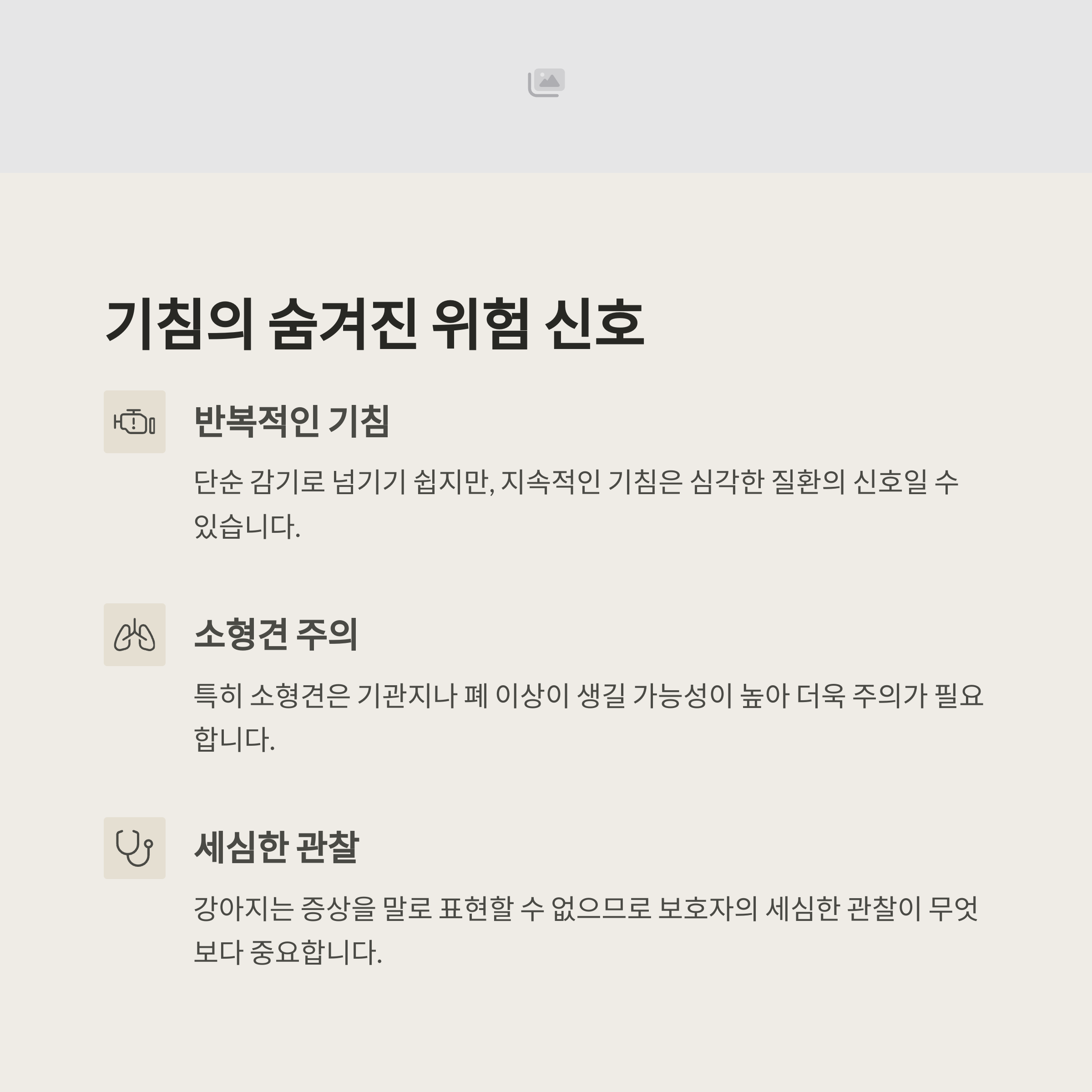 소형견의 경우 이러한 사소한 부분에서도 기관지나 후두 자극이 쉽게 발생할 수 있기 때문에, 보호자의 세심한 관찰과 환경 관리가 매우 중요하다.