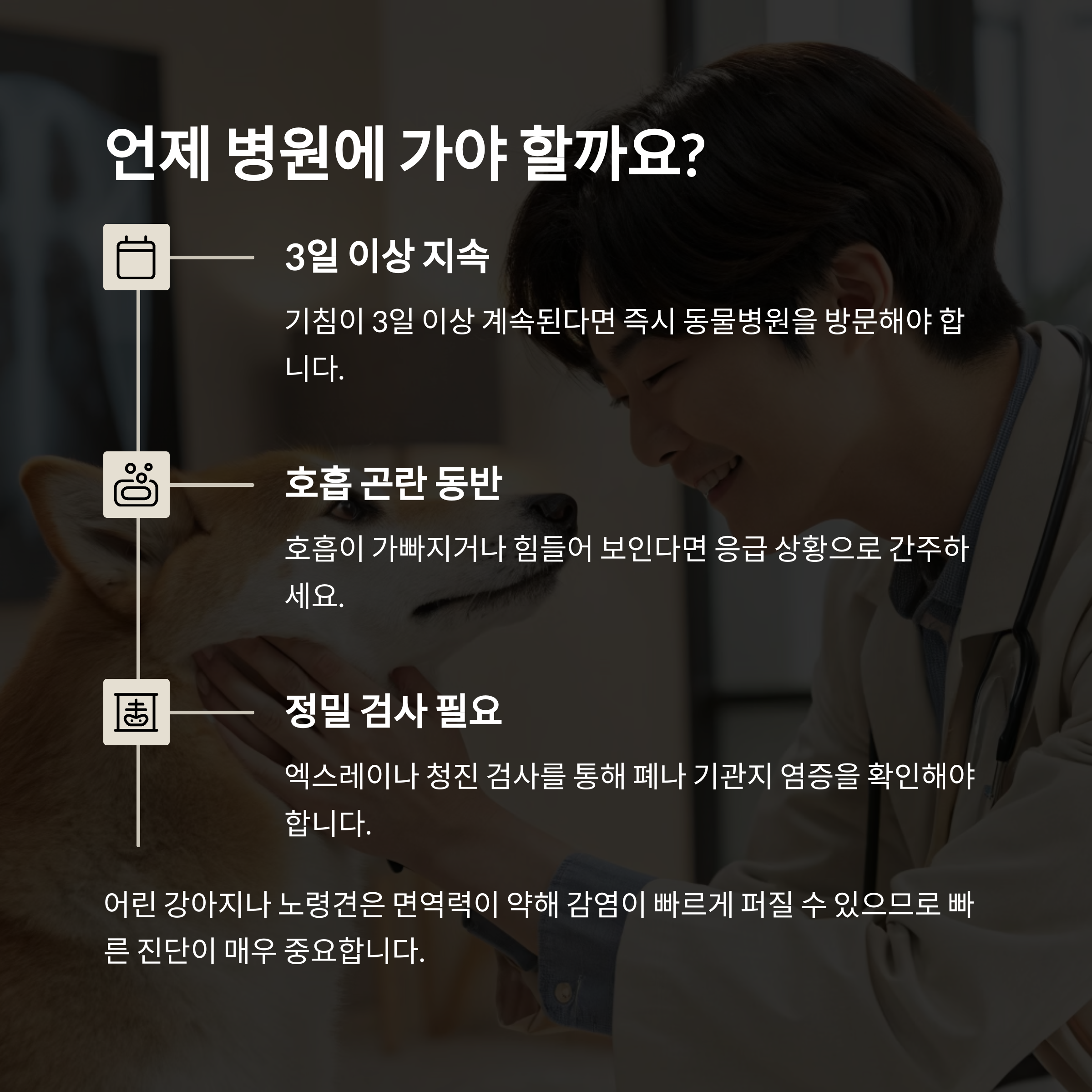 1~2일 정도 간헐적으로 기침하는 경우는 지켜봐도 되지만, 3일 이상 지속되거나 호흡 곤란이 동반되면 즉시 병원을 방문해야 합니다.