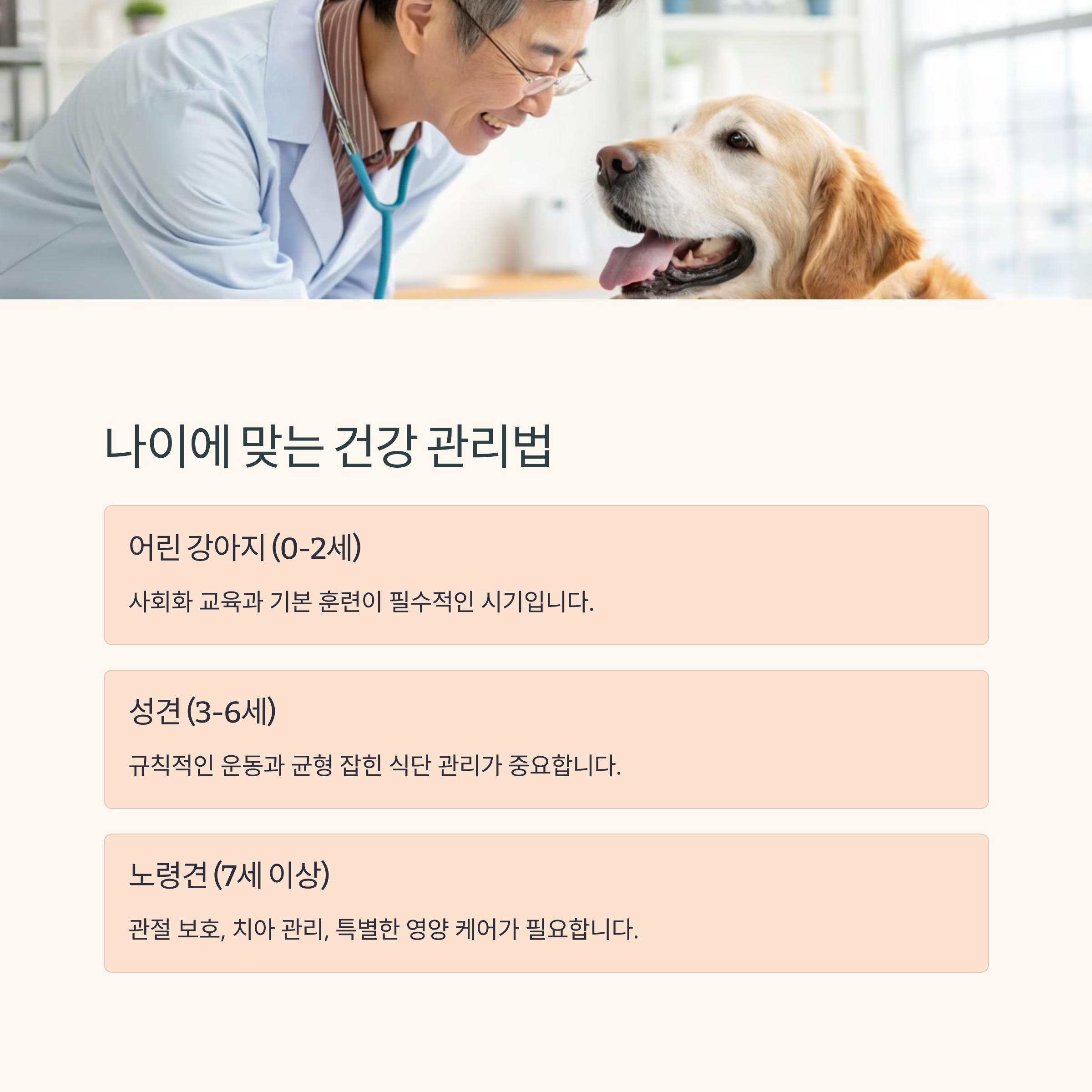반려견의 건강을 유지하려면 나이별 관리가 필요합니다. 어린 강아지는 사회화 교육이 중요하며, 7세 이후에는 관절 보호, 치아 관리, 균형 잡힌 영양이 필수적입니다. 정기적인 건강 검진을 통해 노령견 질환을 예방하는 것이 반려견의 삶의 질을 높이는 핵심입니다.