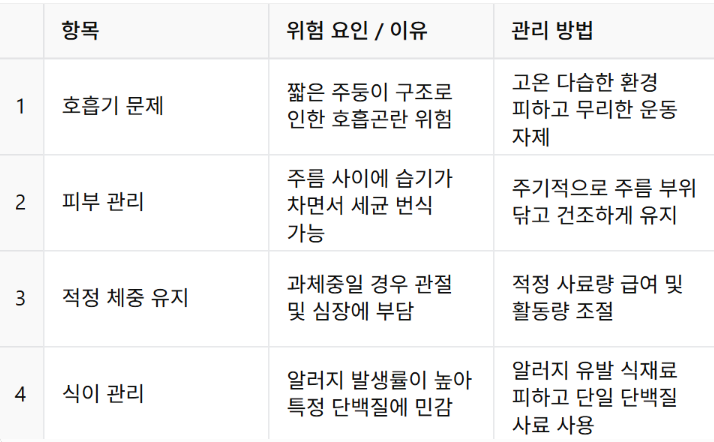 | 건강 | 호흡기 문제에 취약 | 더운 날씨에 주의 |