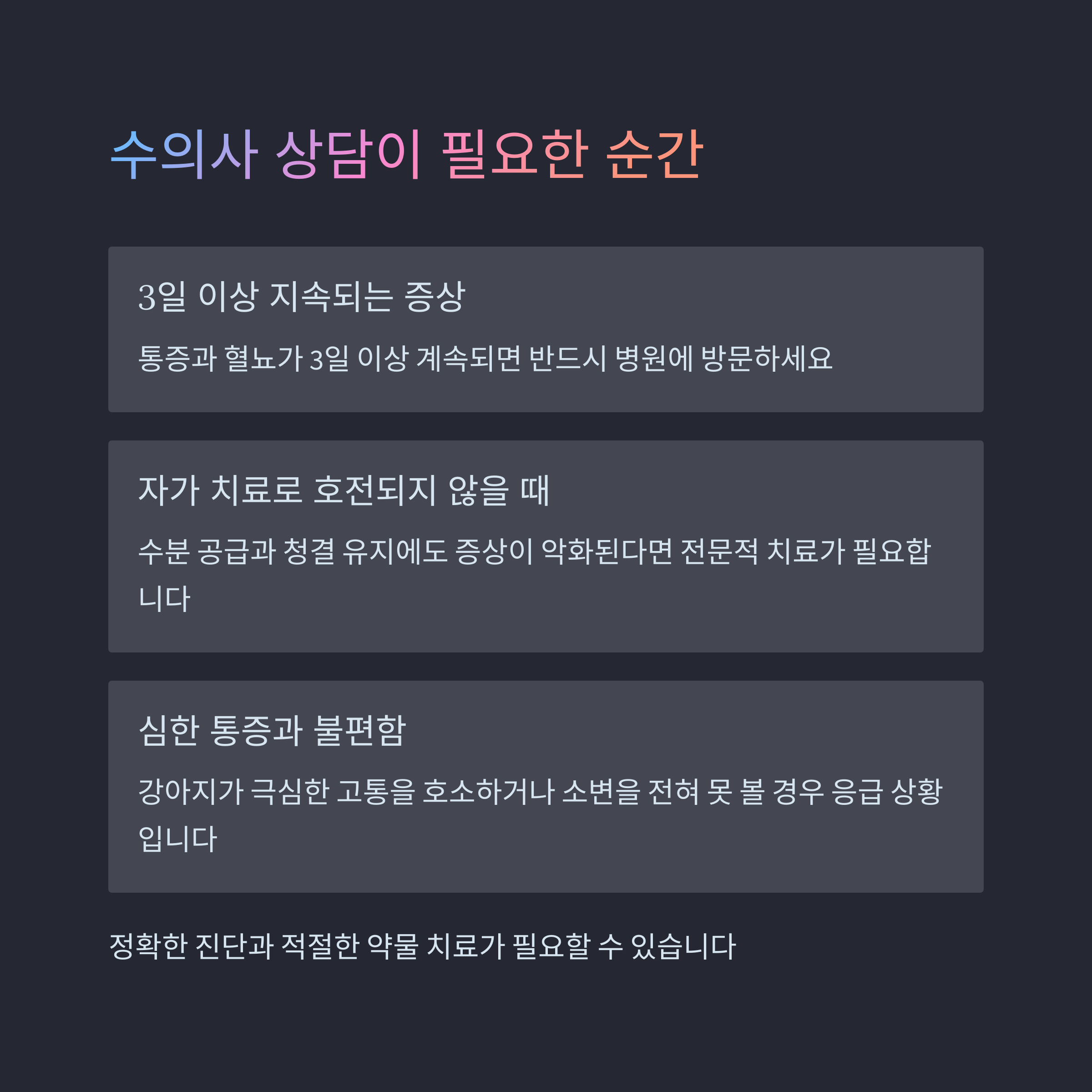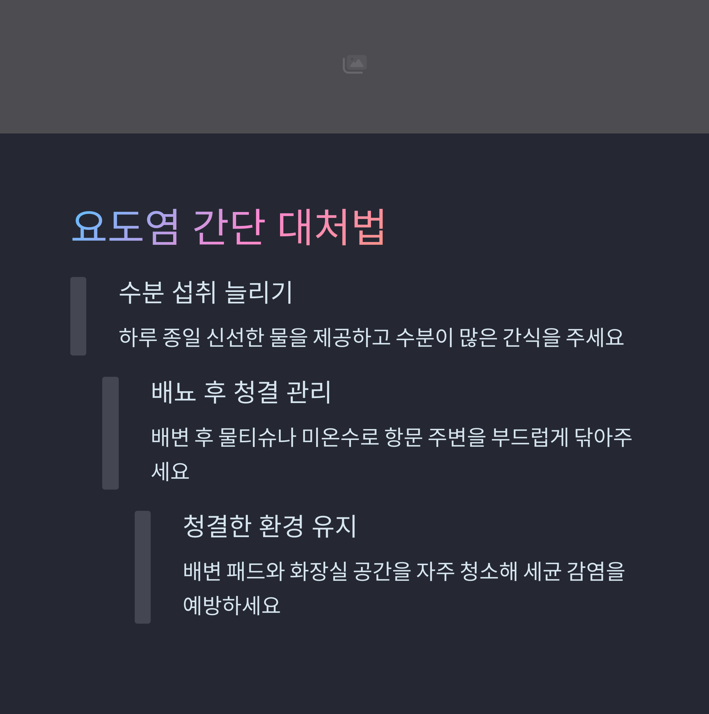 | 초기 대처 방법 | 물 섭취 유도와 청결 관리로 상태 악화를 막아야 해요. |