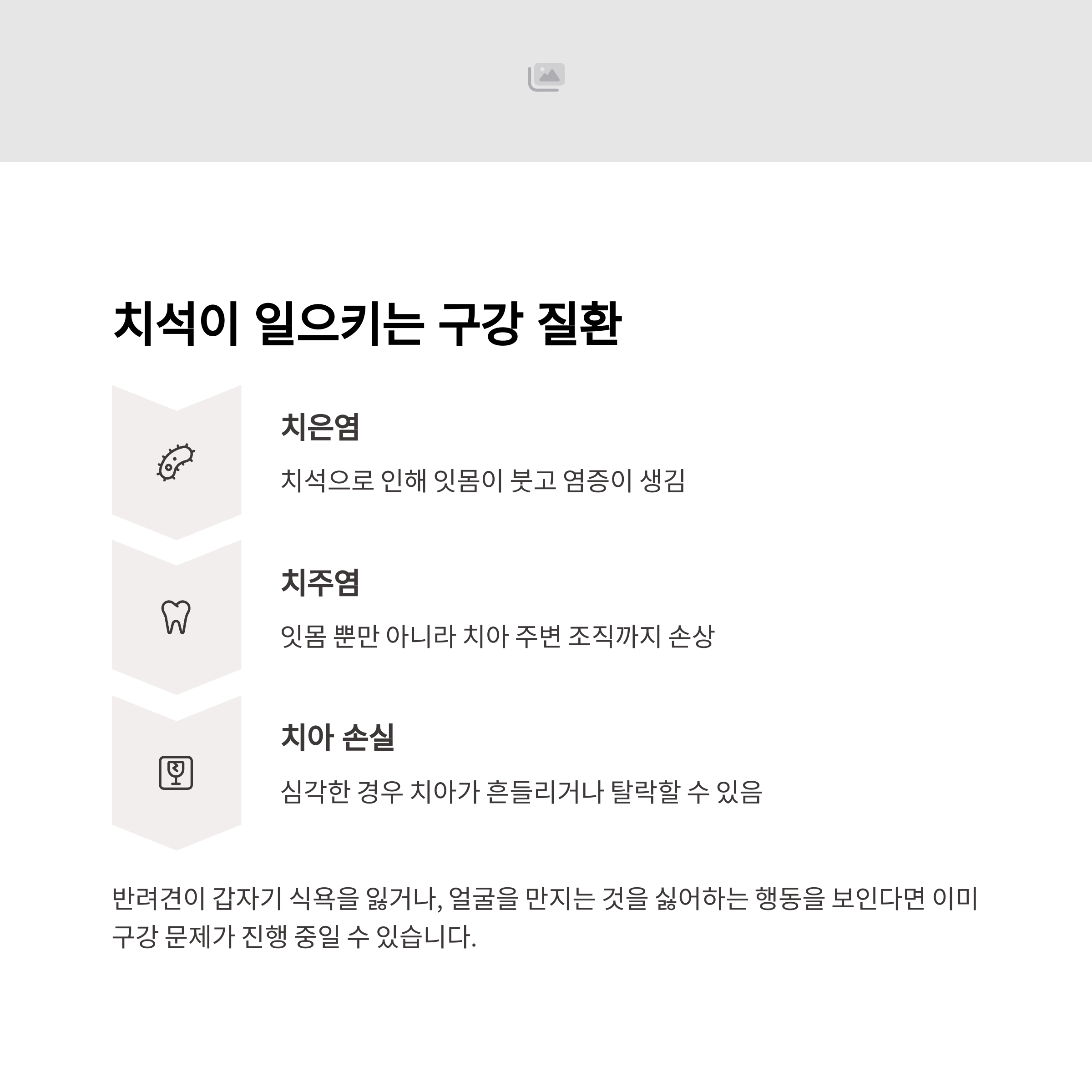 치석이 방치되면 세균이 잇몸으로 침투하면서 치은염이나 치주염으로 발전하게 됩니다. 이는 단순히 입 안의 문제가 아니라, 세균이 혈관을 타고 심장, 간, 신장 등으로 퍼지며 전신 질환을 유발할 수도 있습니다. 반려견이 갑자기 식욕을 잃거나, 얼굴을 만지는 것을 싫어하는 행동을 보인다면 이미 구강 문제가 진행 중일 수 있습니다. 따라서 조기에 확인하고 정기적으로 구강 상태를 체크하는 습관이 필요합니다.