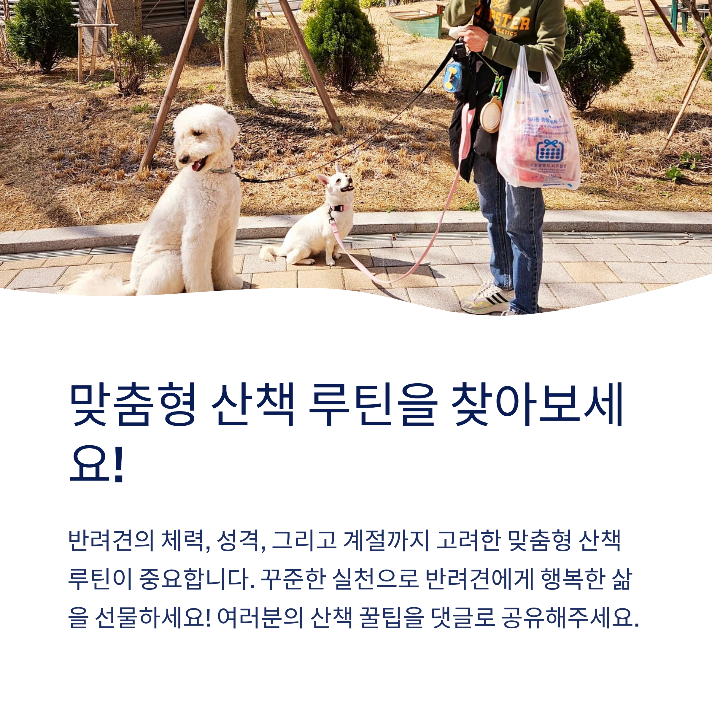 ※ 위 사진 속 강아지들은 제가 함께 생활하는 반려견, **대형견 '콩순이'와 소형견 '하얀이'입니다.** 성격도, 체력도 다른 두 아이를 돌보며 각자의 맞춤 산책 루틴을 찾아가는 과정을 직접 경험하고 있어요!