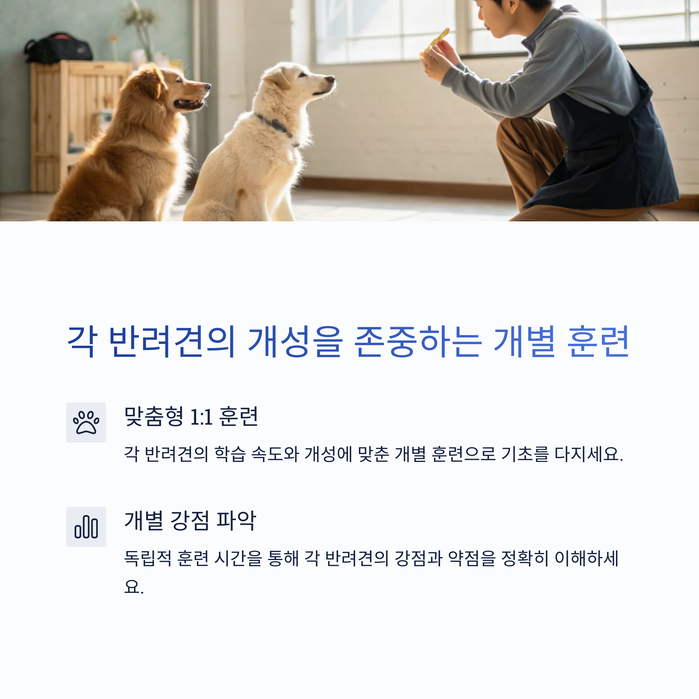 | 차례 지키기 습관화, 명령어 사용 강조 | 알러지 고려, 기호성 높은 건강 간식 | 개별 훈련 후 병행 훈련으로 확대 |