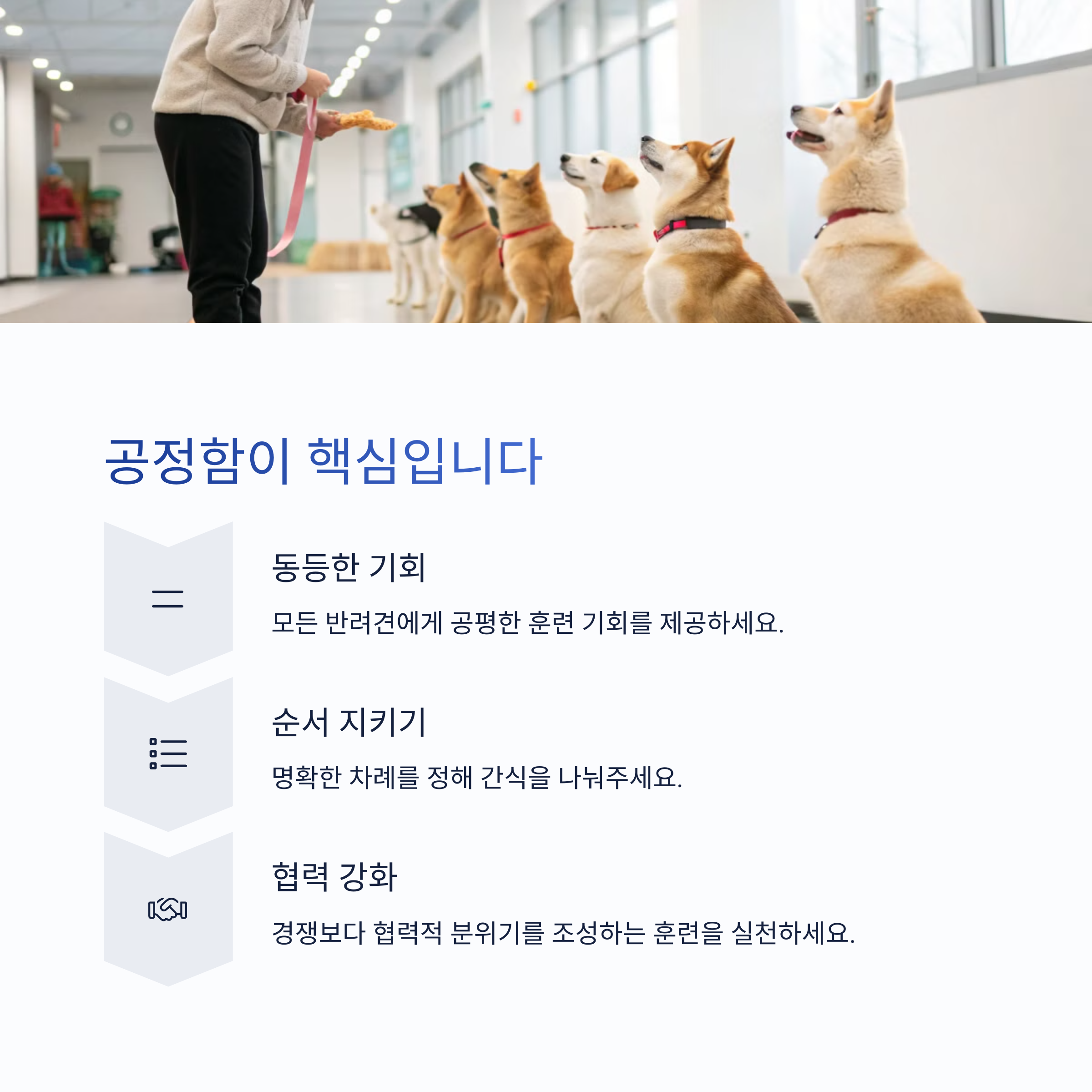 | 다견 훈련의 핵심 | 질서 유지와 차례 훈련이 핵심입니다. |