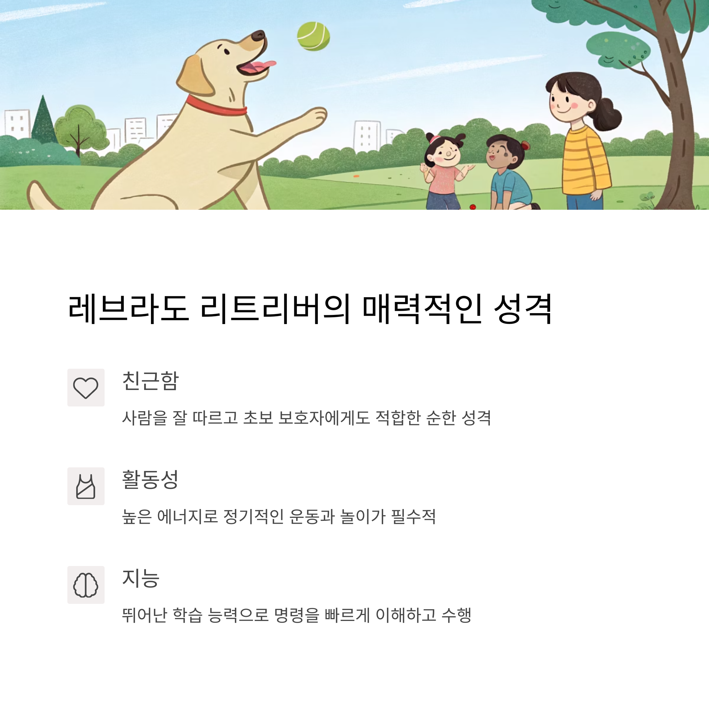 충분한 활동량과 꾸준한 교육이 함께 병행된다면, 리트리버는 가족에게 깊은 유대감을 주는 안정적인 반려견으로 성장할 수 있다.