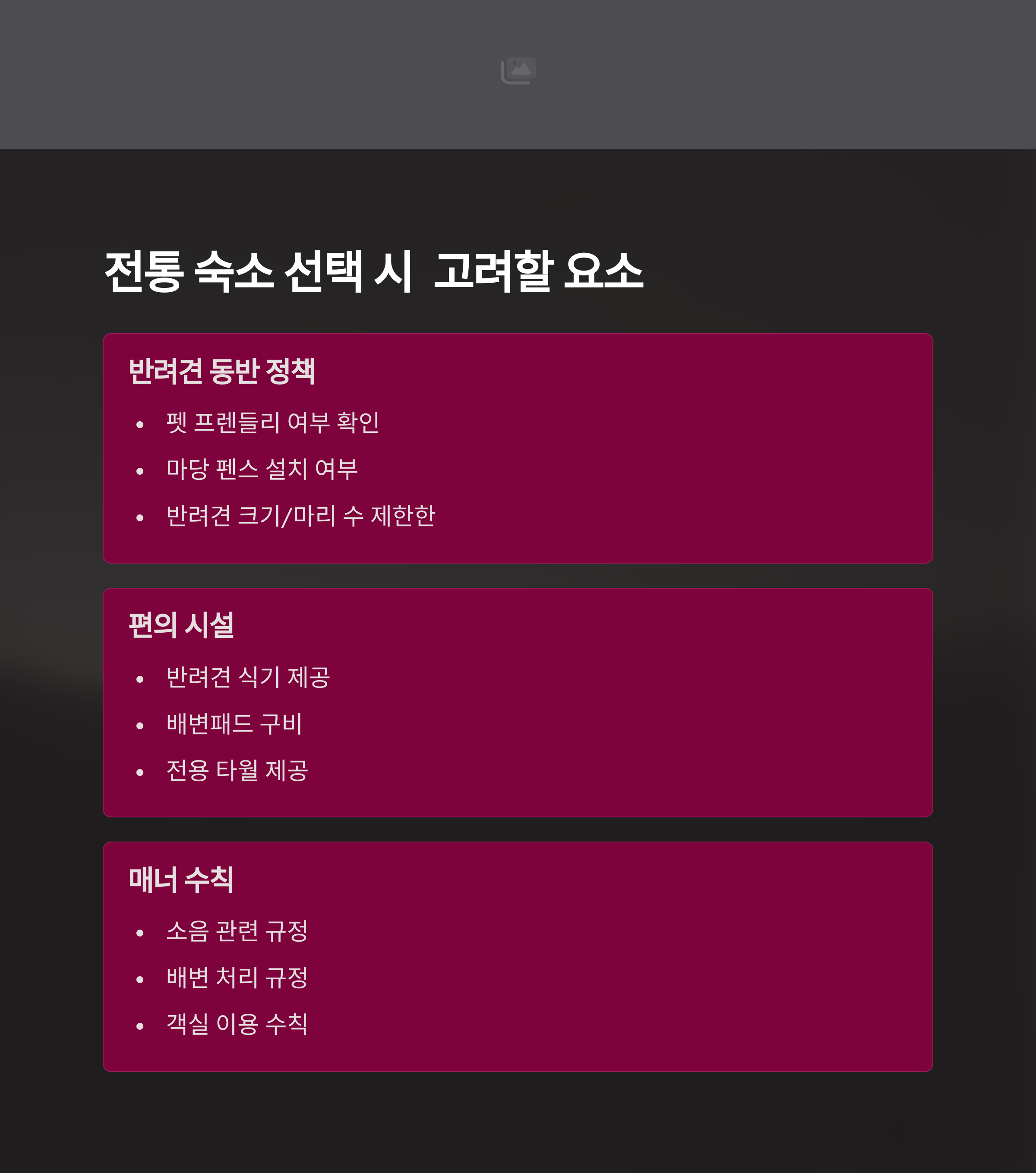 | 강아지와 함께 편하게 머물 수 있는 공간 | 감성 가득한 전통 한옥 소개 | 자연과 전통이 어우러진 장소 |