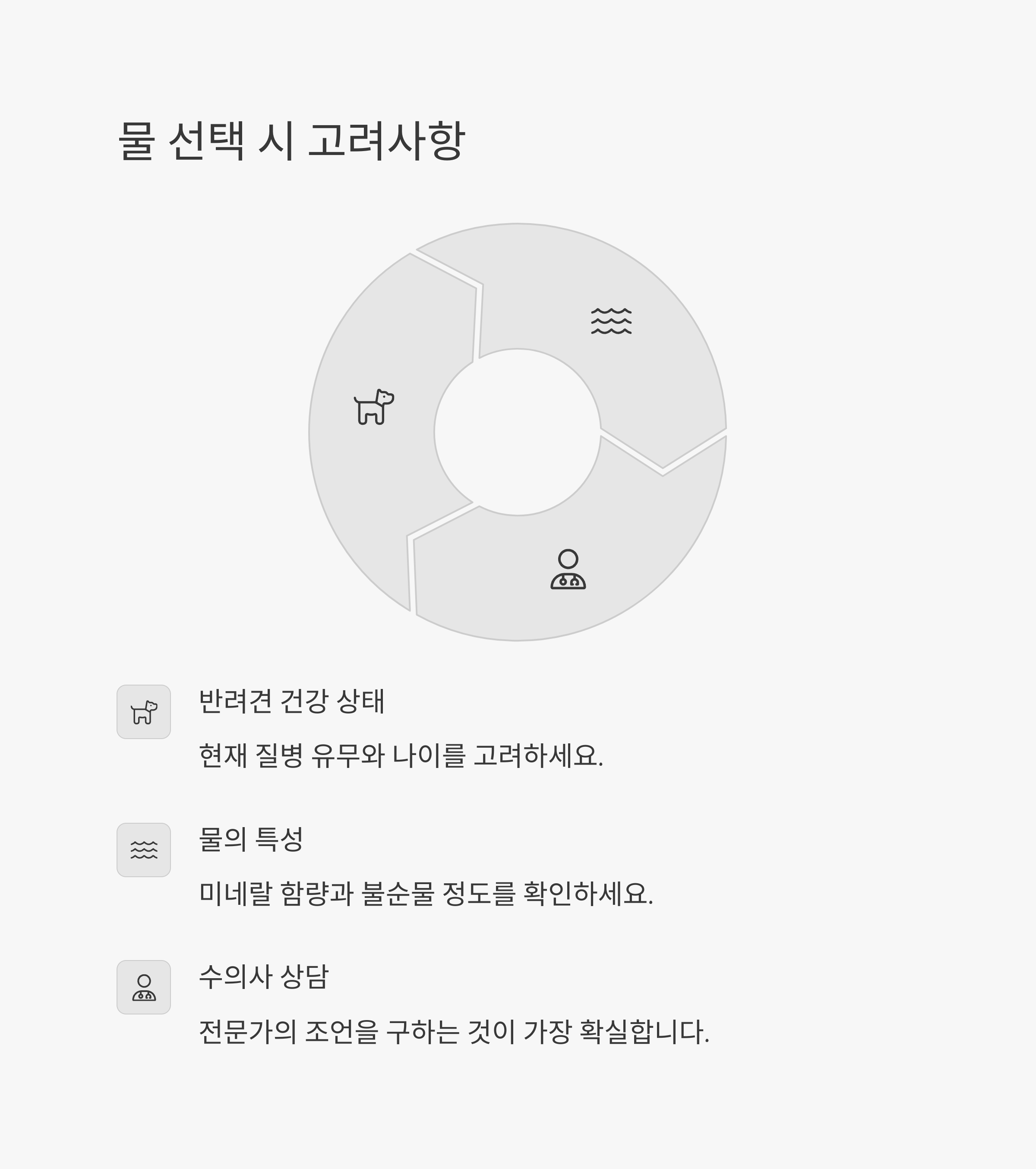 최적의 물 선택을 위해 보호자는 반려견의 건강 상태를 고려해야 합니다. 신장 질환이 있는 반려견이라면 미네랄이 적은 정수기 물이 적합할 수 있으며, 건강한 반려견이라면 생수도 좋은 선택이 될 수 있습니다. 수돗물을 사용할 경우, 염소 성분을 줄이기 위해 10~15분 정도 끓인 후 식혀서 급여하는 것이 좋습니다.