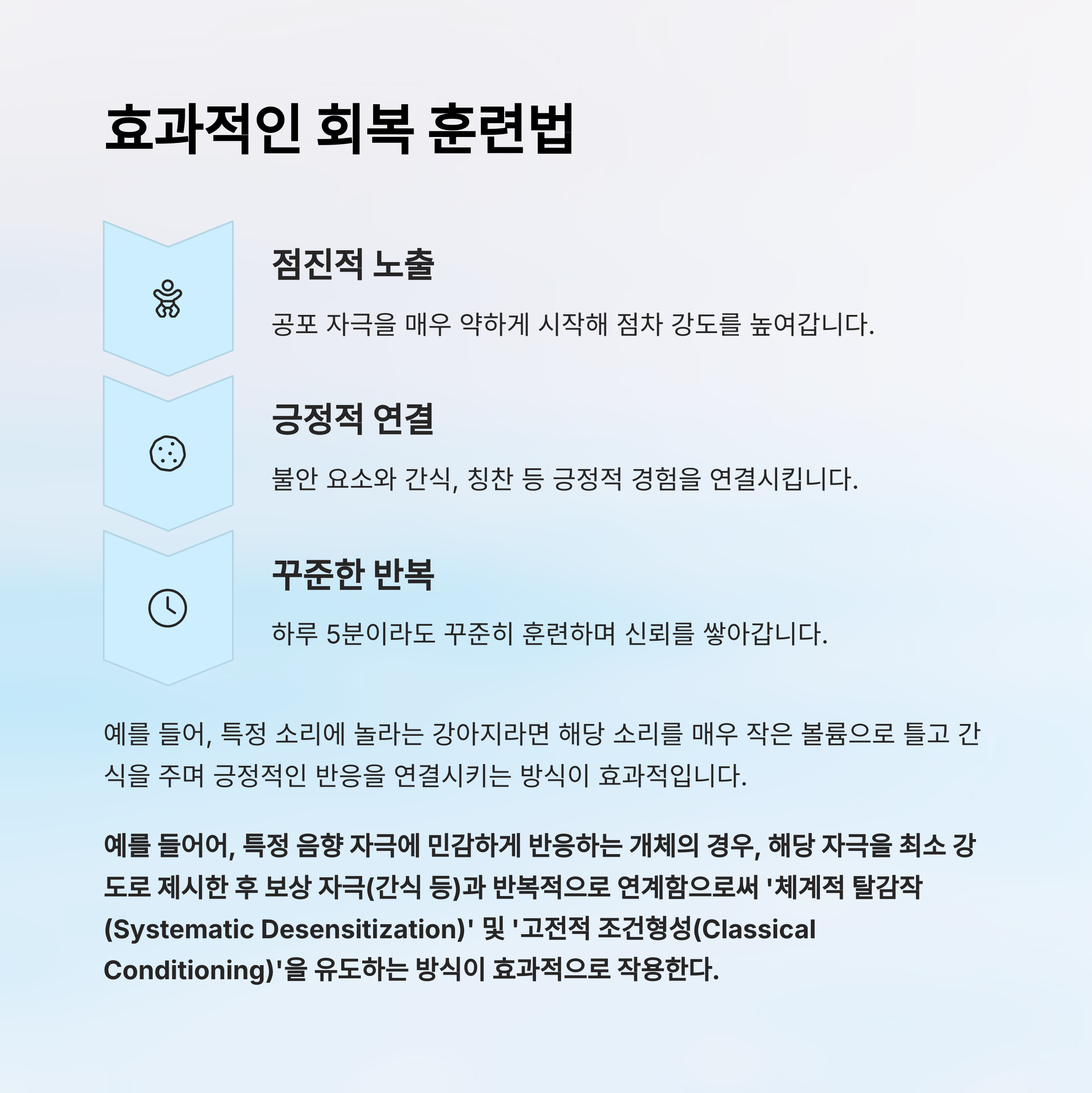 | 회복을 위한 핵심 | 반복적인 노출 훈련과 보호자의 안정감 있는 대응 |