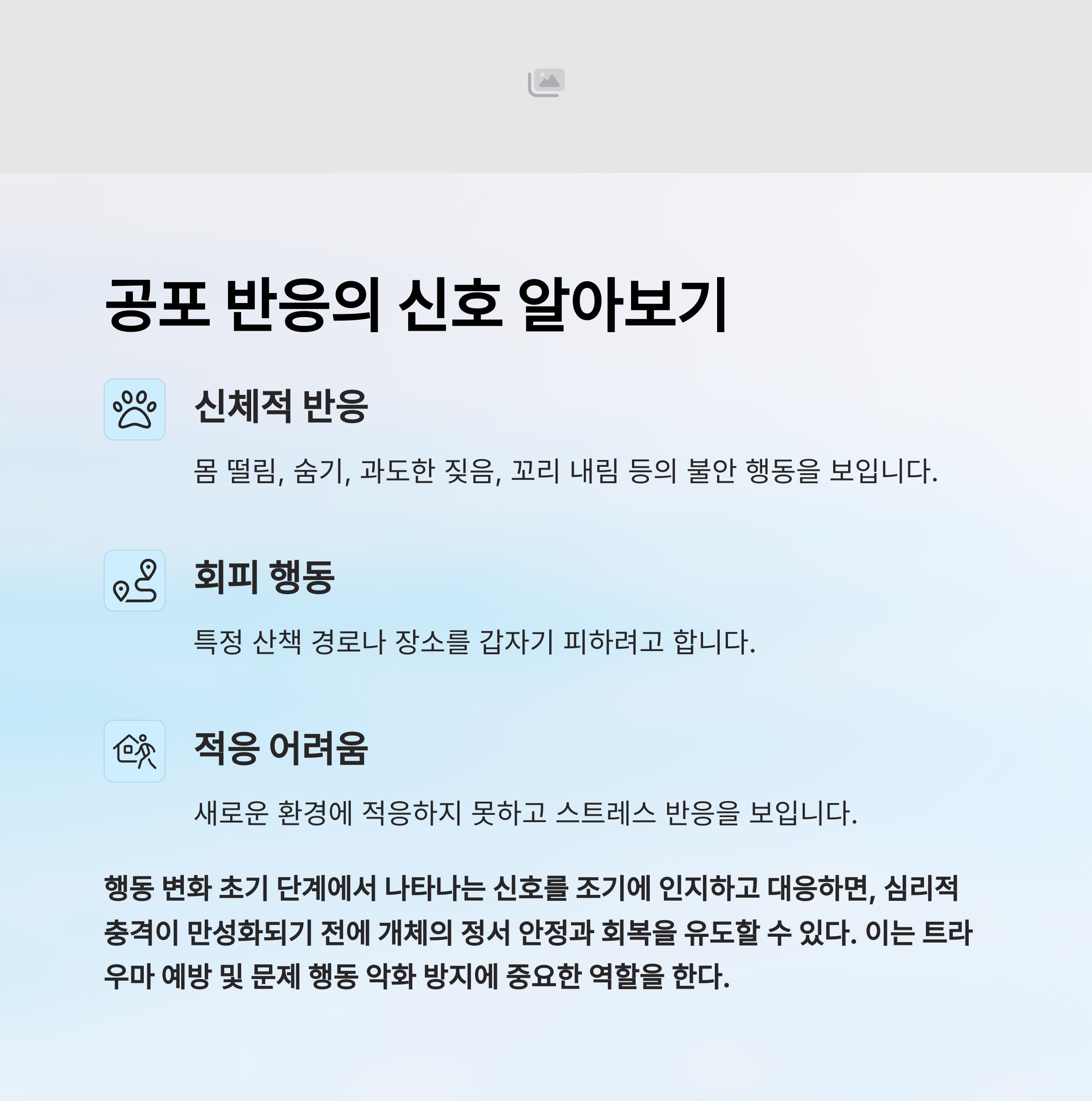 반려견은 특정 자극에 의해 공포심이나 트라우마 반응을 보일 수 있으며, 이는 갑작스러운 행동 변화로 이어질 수 있다. 예기치 못한 소음, 특정 산책 경로 회피, 공격성 등으로 나타나는 이러한 반응은 단순한 훈련만으로는 해결되지 않는 경우가 많다. 특히 과거의 부정적 경험으로 인해 생긴 심리적 충격은 보호자의 섬세한 접근과 이해를 필요로 한다. 아래에서는 공포 기반 행동에 효과적으로 대처할 수 있는 실천적 방법과 사례를 바탕으로 회복을 돕는 전략을 정리한다.