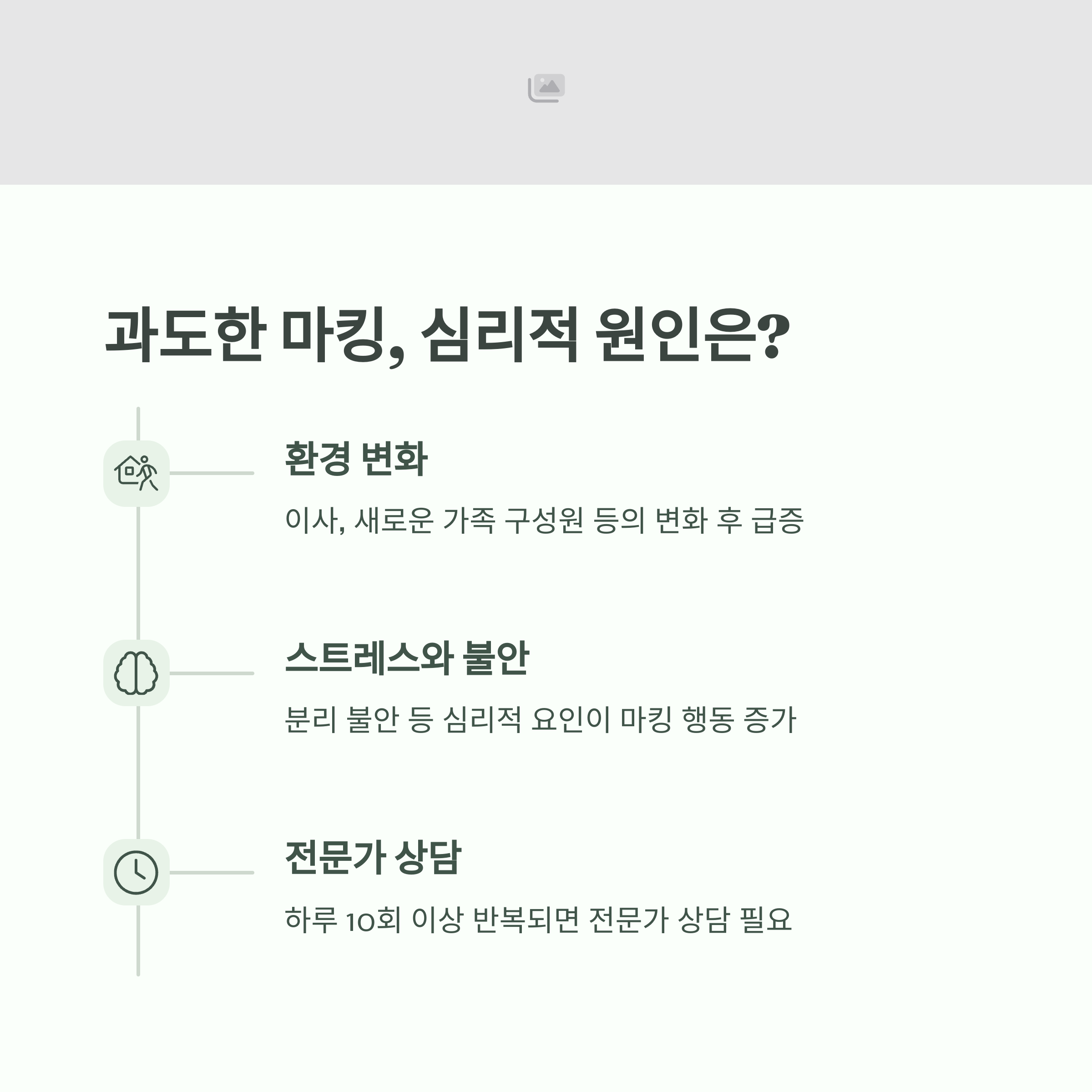 | 영역 표시 본능, 불안감 | 환경 변화, 이사, 낯선 사람 | 긍정 강화 훈련, 스트레스 완화 |