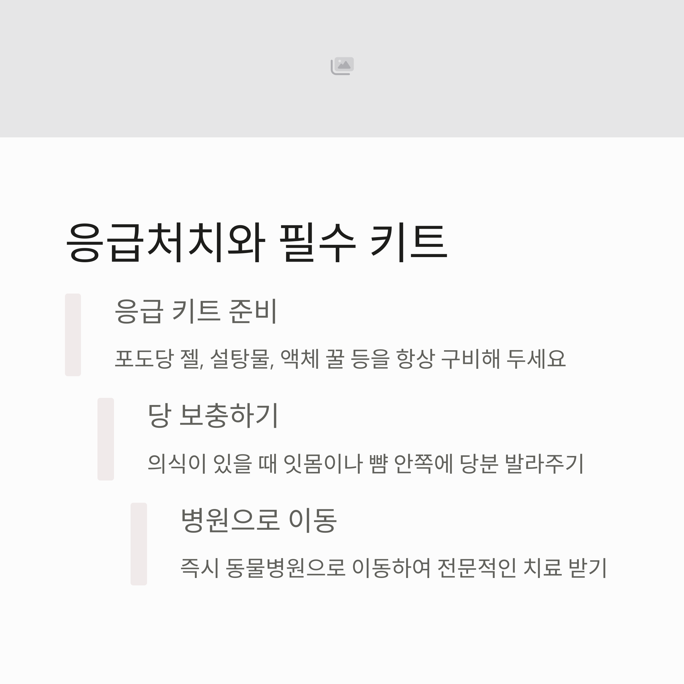| 응급 대처 방법 | 빠른 당 보충과 수의사에게 신속히 연락 |