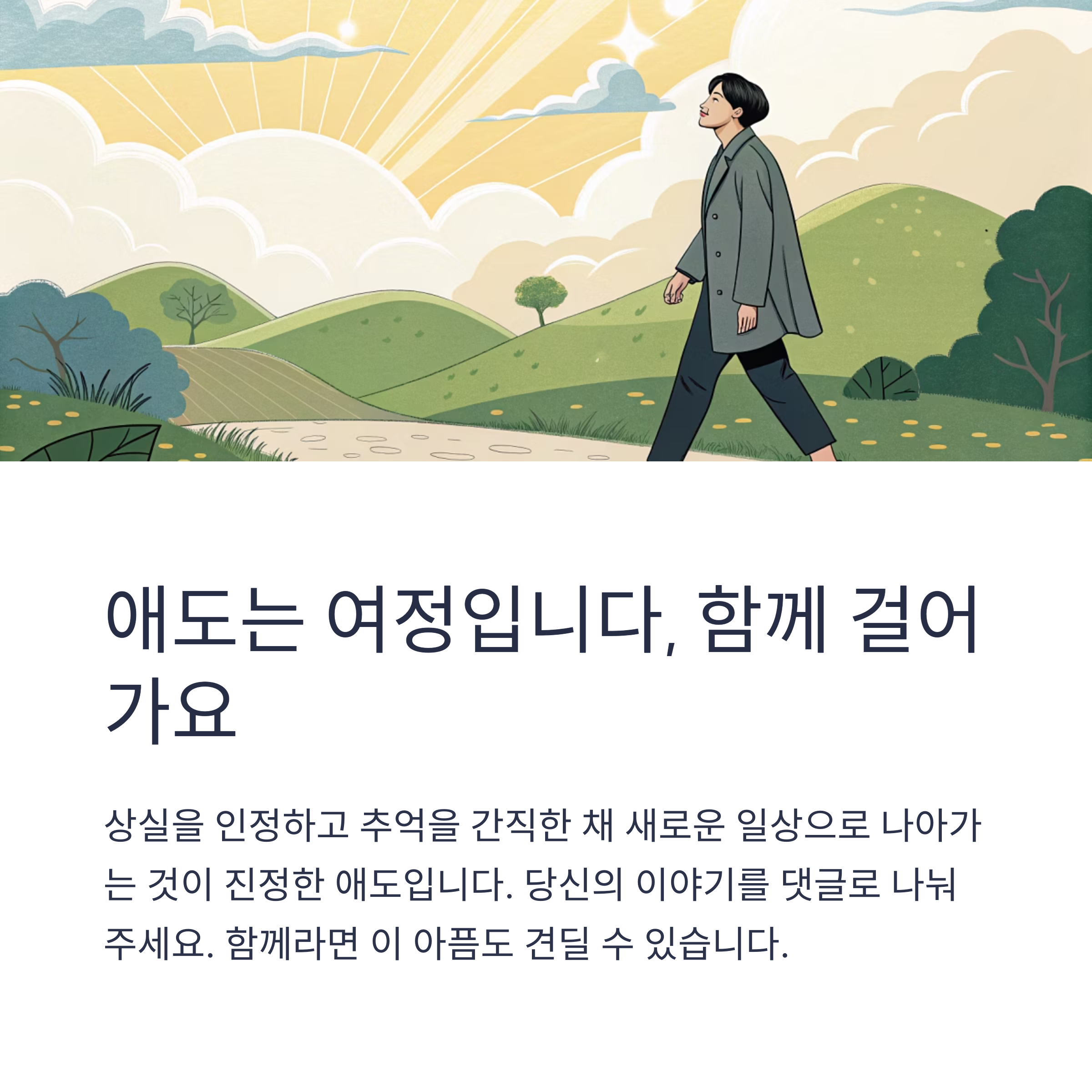 | 전문가 상담, 지지 모임 참여도 도움 | 함께할 시간의 의미를 더해주는 과정 | 마음을 정리하며 애도할 수 있는 방법 |