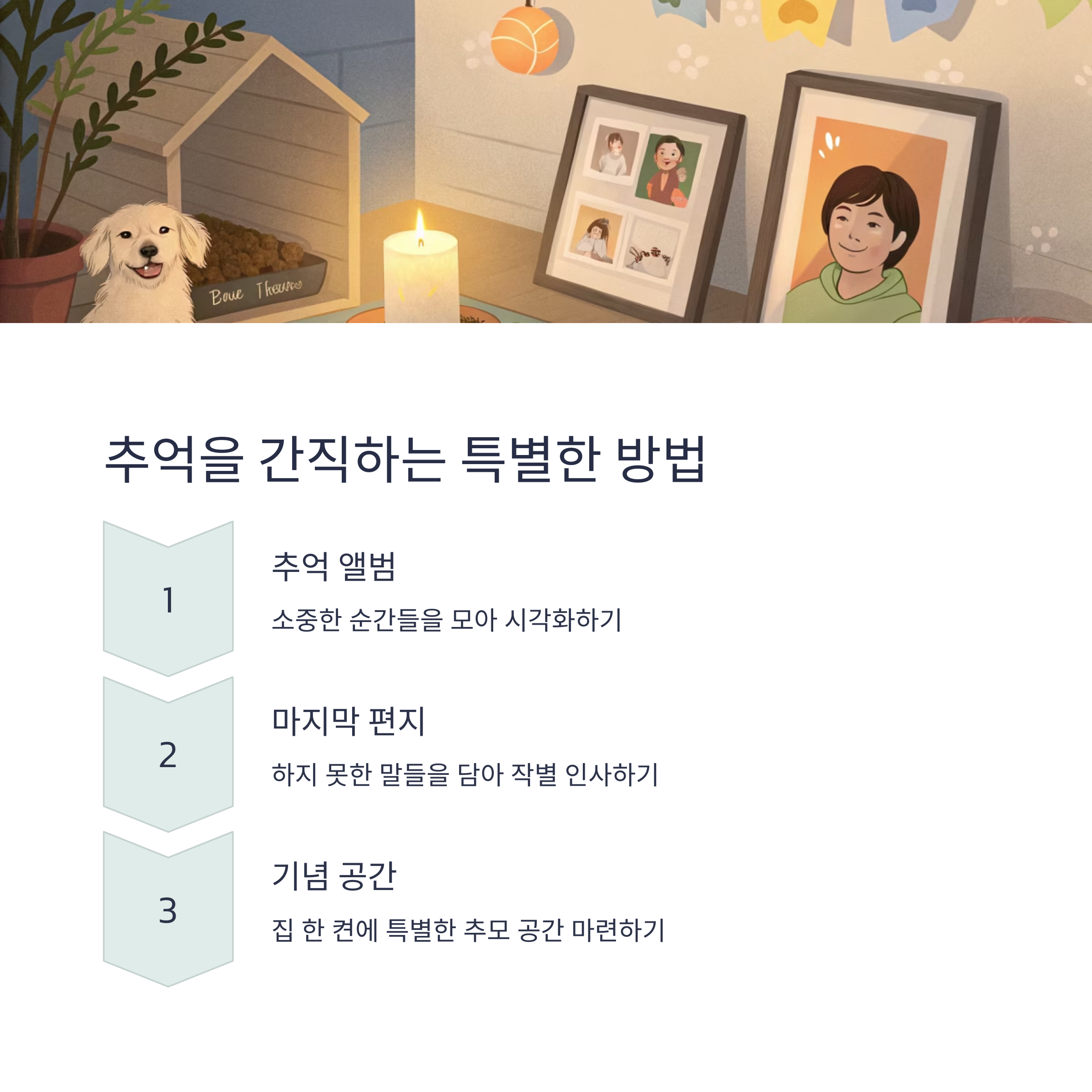 | 상실 후의 심리적 충격, 회복 과정 필요 | 감정 준비, 기록, 마지막 인사 등 포함 | 사진, 영상, 손편지로 추억 정리 |