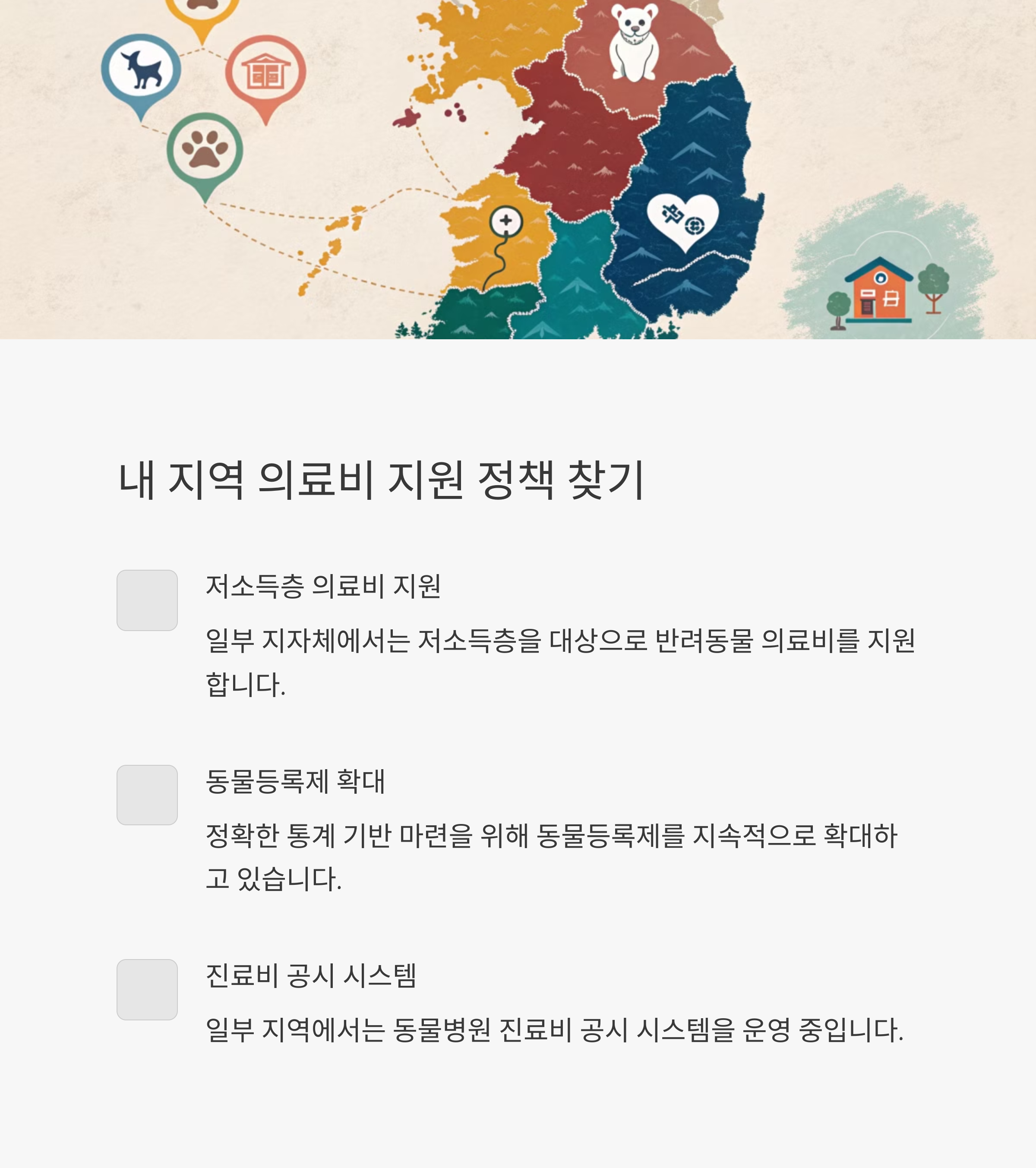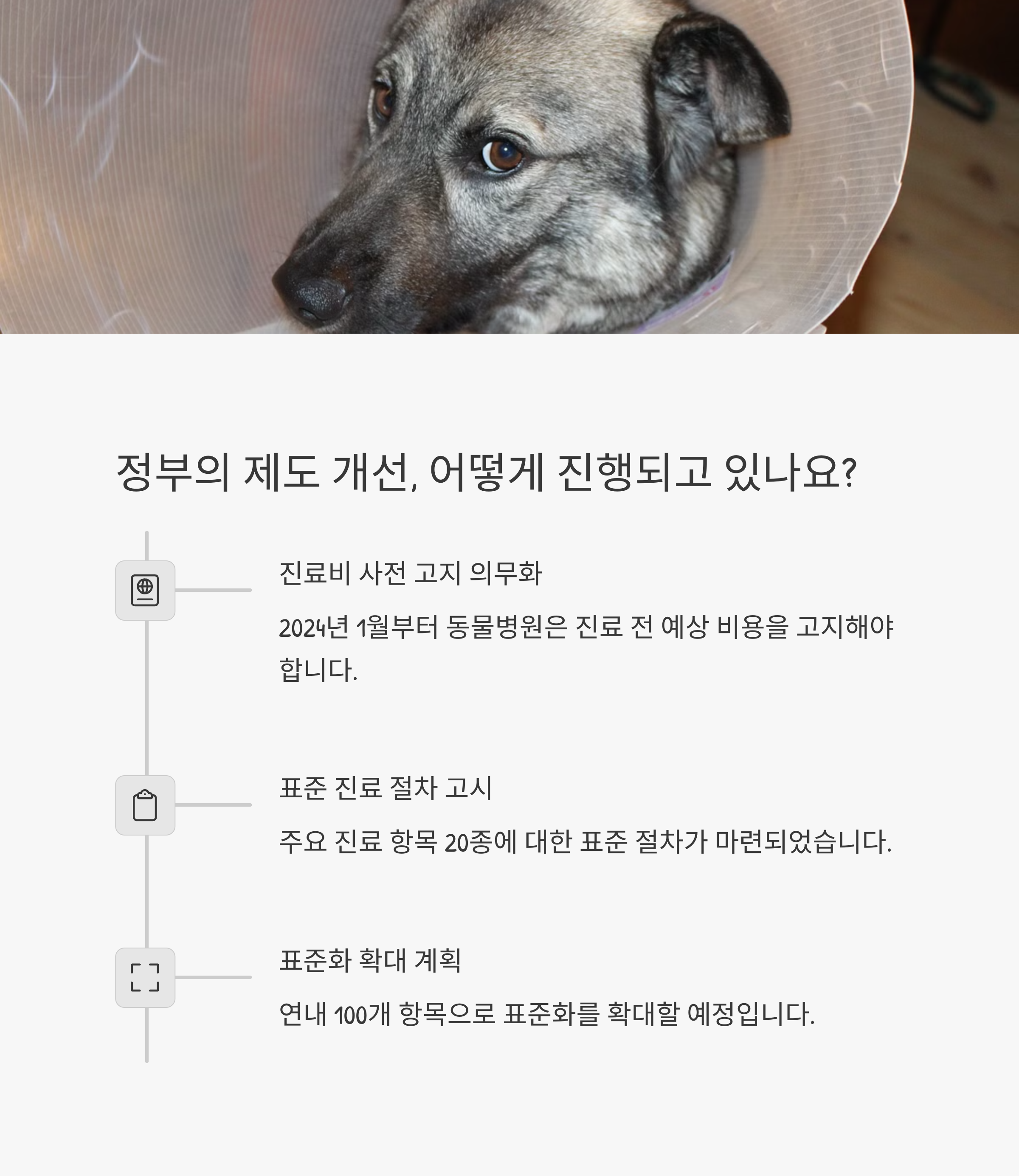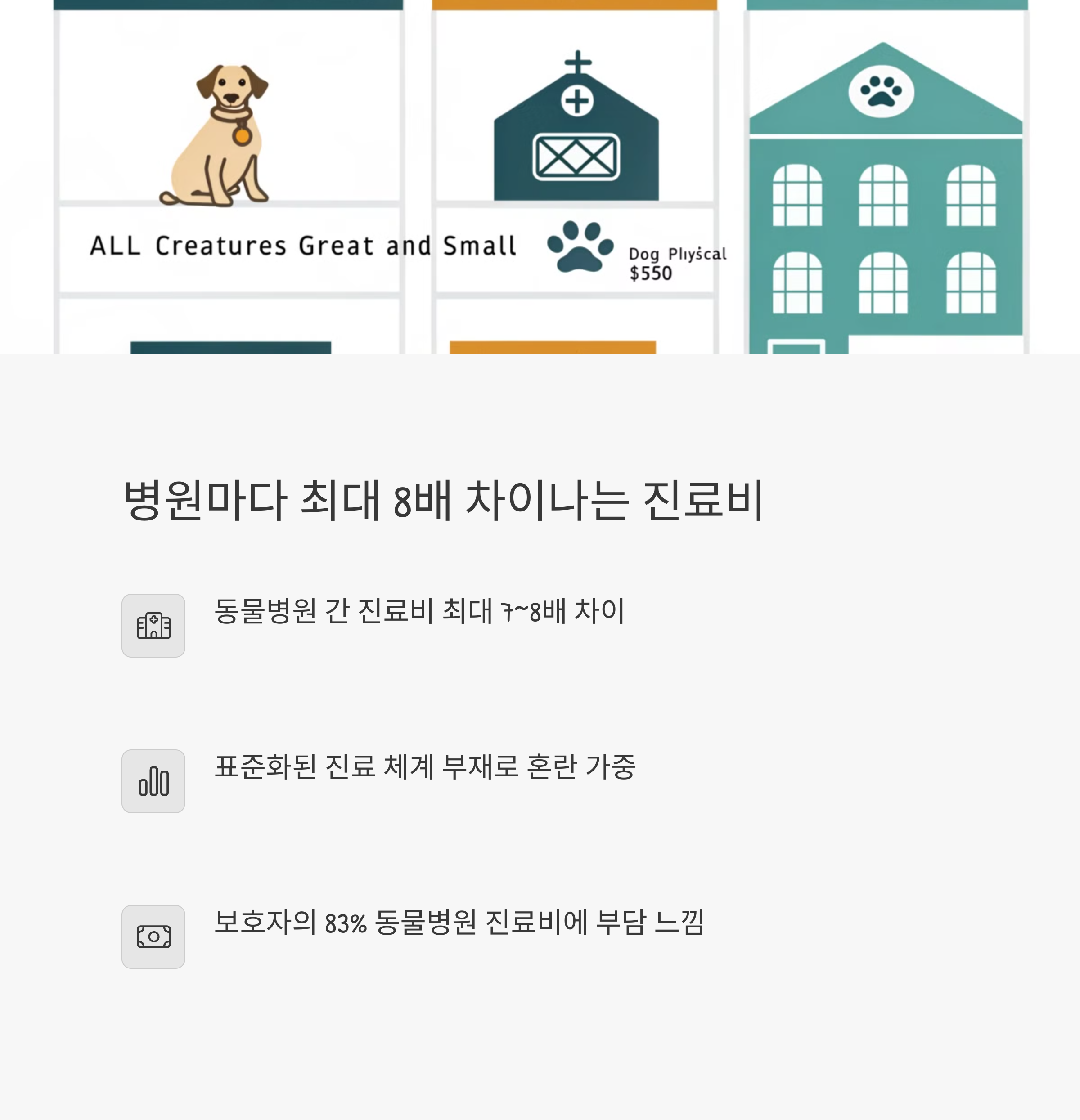 | 병원마다 가격 차이가 커 보호자 부담이 큽니다. | 진료비를 보장받는 보험의 필요성이 증가합니다. | 국가 차원의 진료비 기준 마련이 요구됩니다. |