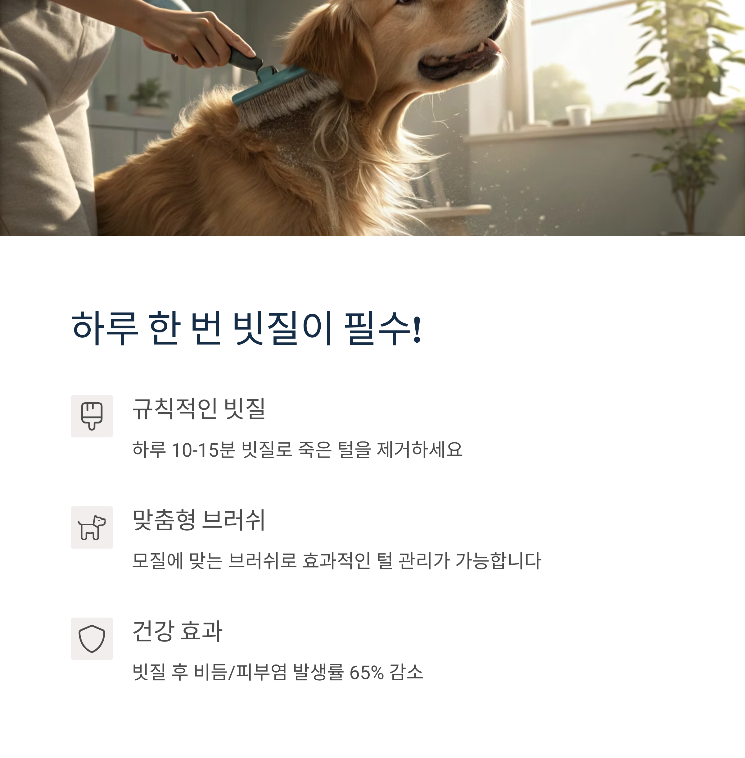 | 하루 1회 이상이 이상적 | 물기 제거 후 보송하게 말리기 | 피모 윤기 유지, 피부 건조 예방 |