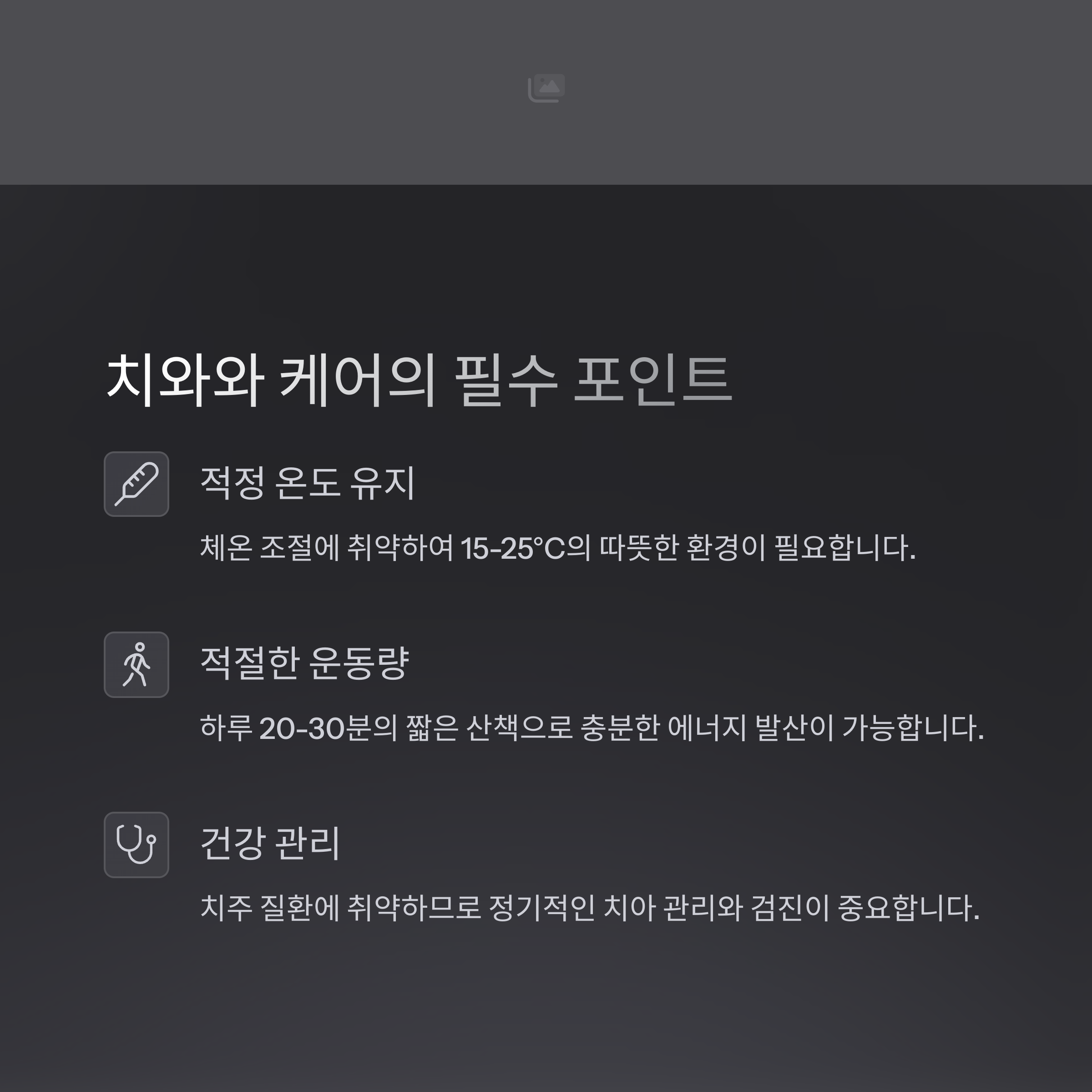 | 따뜻한 옷, 담요, 따뜻한 방 환경이 필요합니다. | 낯선 사람이나 반려동물과의 반복된 만남이 중요합니다. | 정기적인 예방접종과 치아 관리가 필수입니다. |