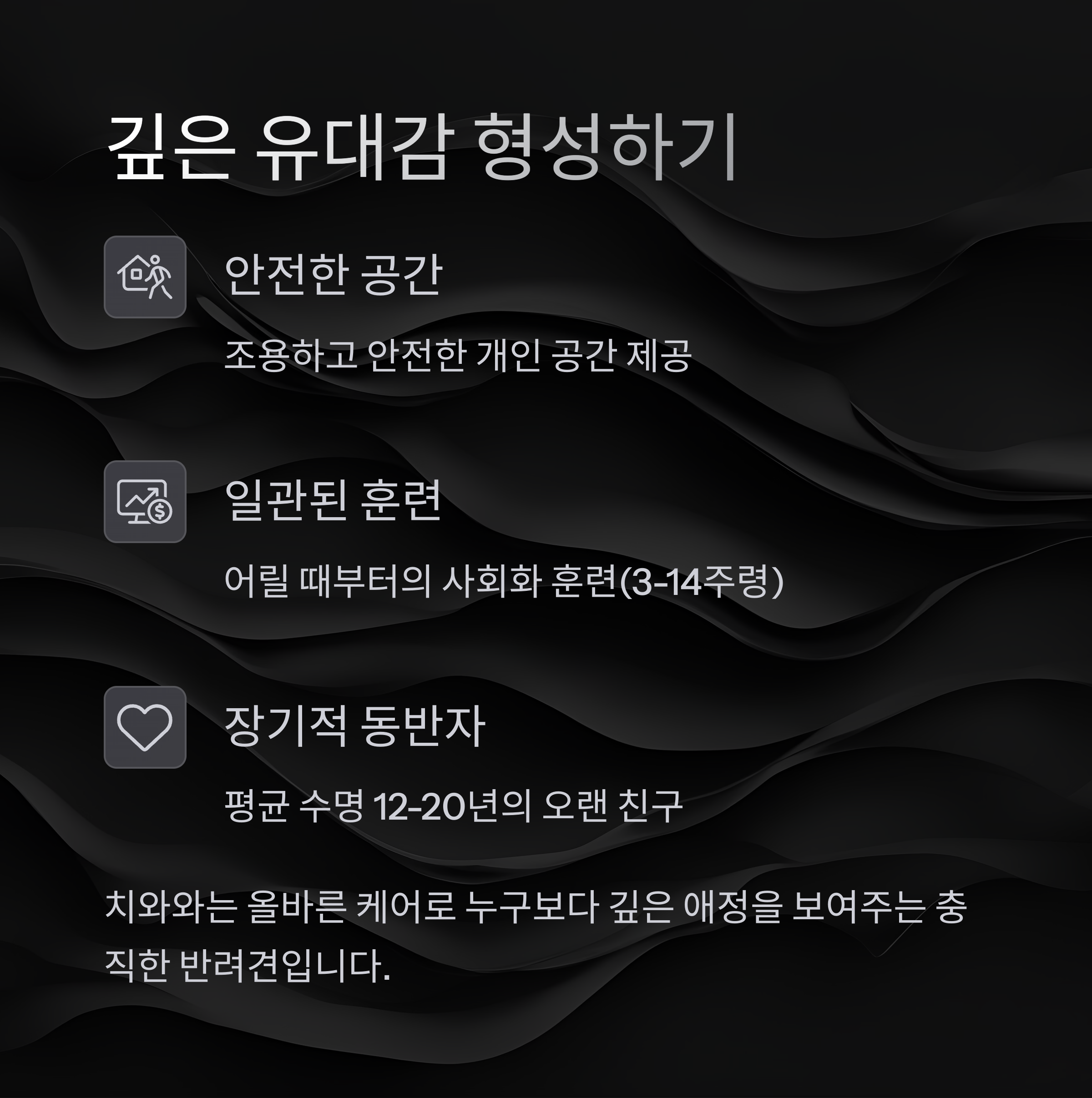 치와와를 키우는 데 있어서 가장 중요한 점은 체온 유지입니다. 체구가 작아 외부 온도의 영향을 많이 받기 때문에 추운 날씨에는 반드시 보온에 신경 써야 하며, 실내에서도 냉기가 직접 닿지 않도록 주의해야 합니다. 또한 활동량은 적지만 에너지가 넘치기 때문에 짧은 산책을 자주 해주는 것이 좋습니다. 장난감을 통한 놀이도 효과적이며, 이는 지루함을 줄여주고 문제 행동을 예방하는 데 큰 도움이 됩니다. 무엇보다 주인의 애정 어린 관심과 칭찬은 치와와에게 최고의 보상입니다.