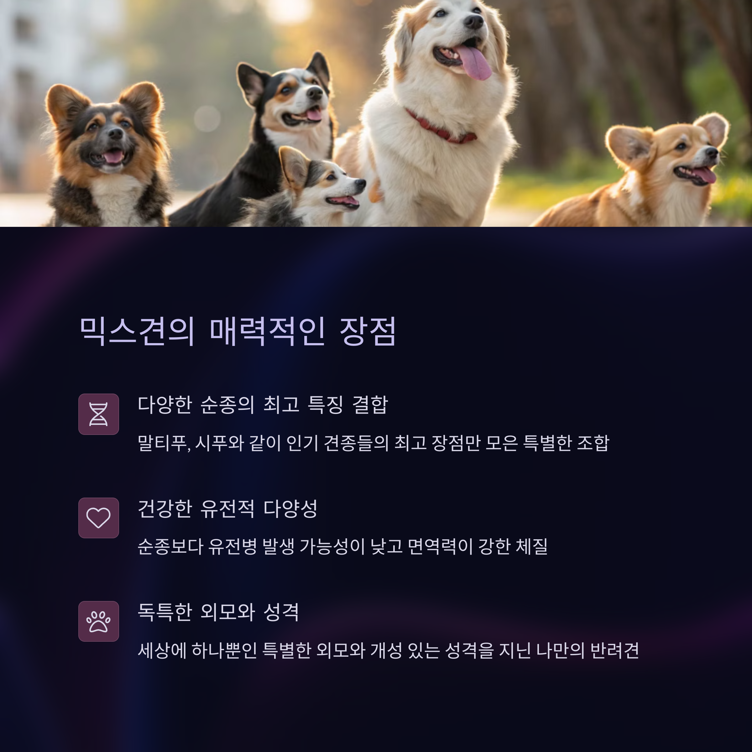 | 믹스견이란? | 서로 다른 견종을 교배하여 태어난 반려견이에요. |