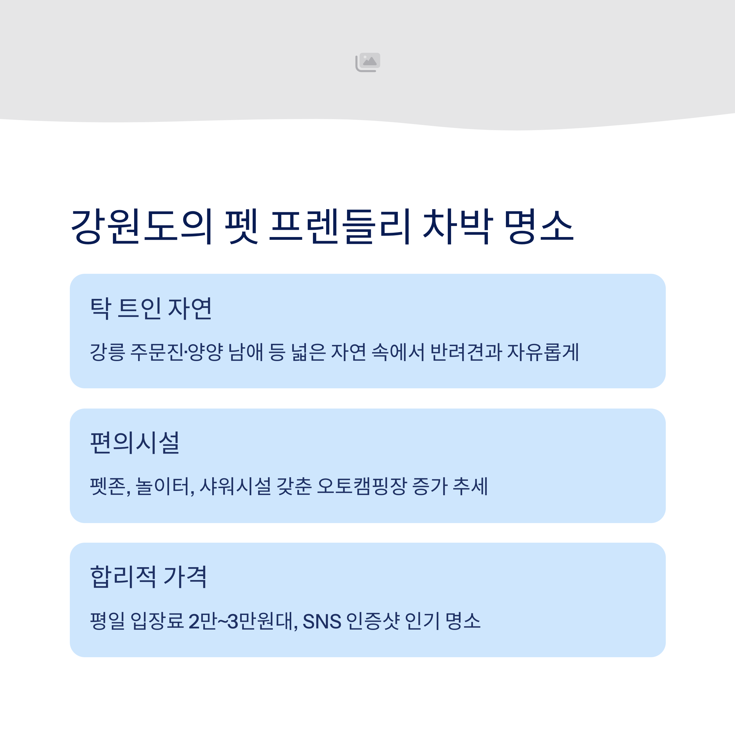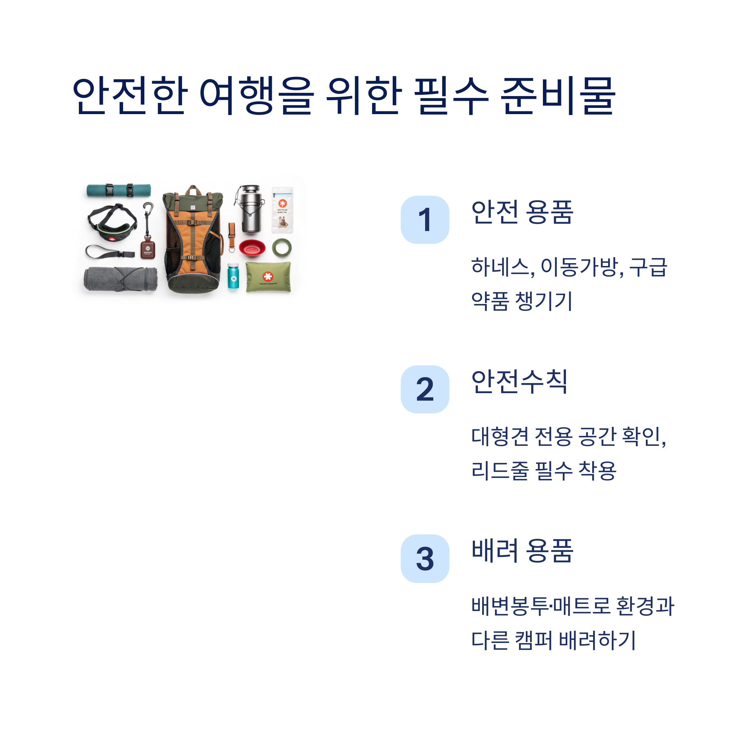 | 차량 이동과 숙박이 가능한 장소 구성 | 반려견 운동장, 샤워장 등 시설 중요 | 주변 볼거리 및 날씨 조건 고려 |