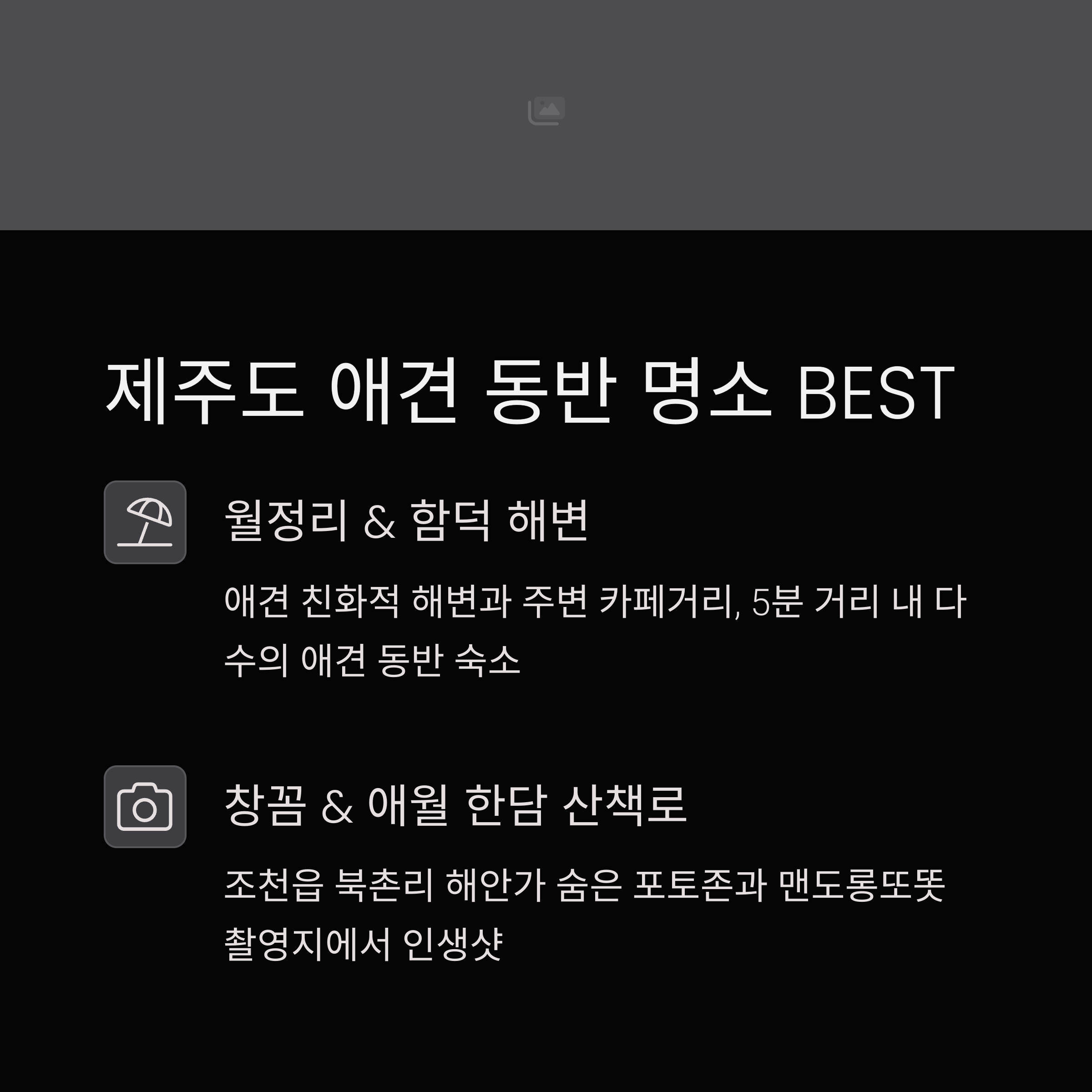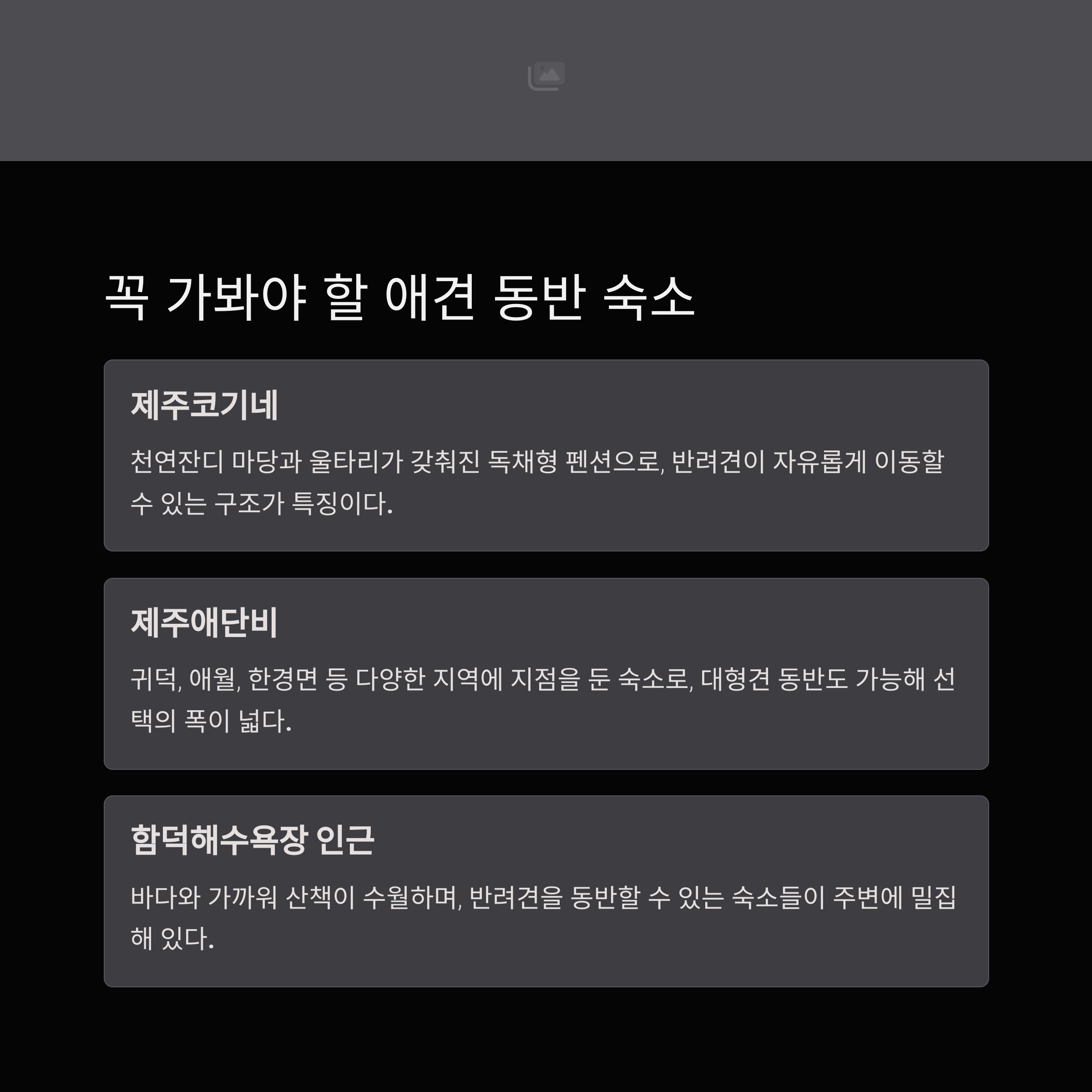 | 반려견 동반 숙소 | 애견 전용 숙소 위주로 안전하고 편안한 곳을 소개합니다. |