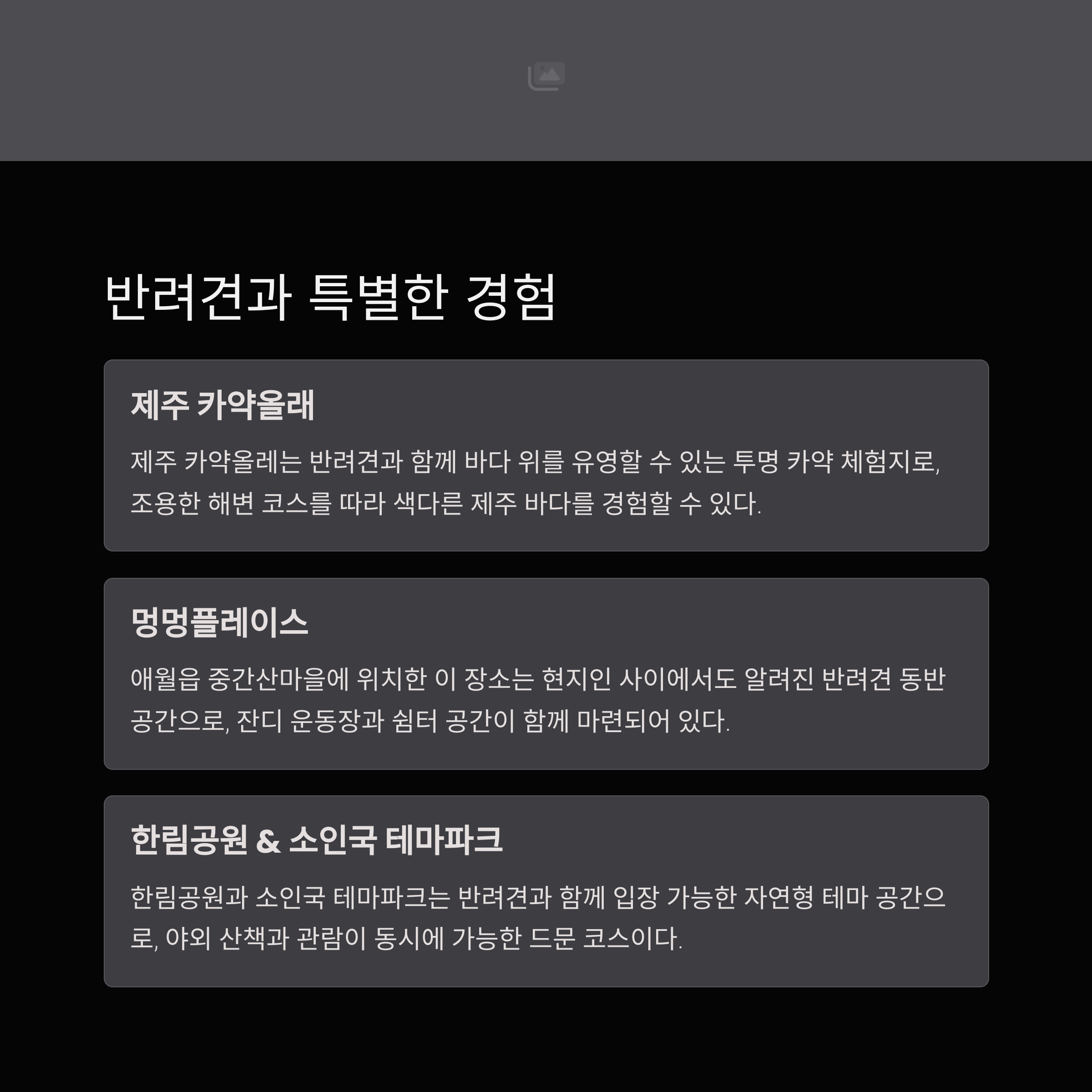 | 반려견과 갈 수 있는 명소 | 입장 가능한 관광지 및 산책하기 좋은 코스를 추천합니다. |