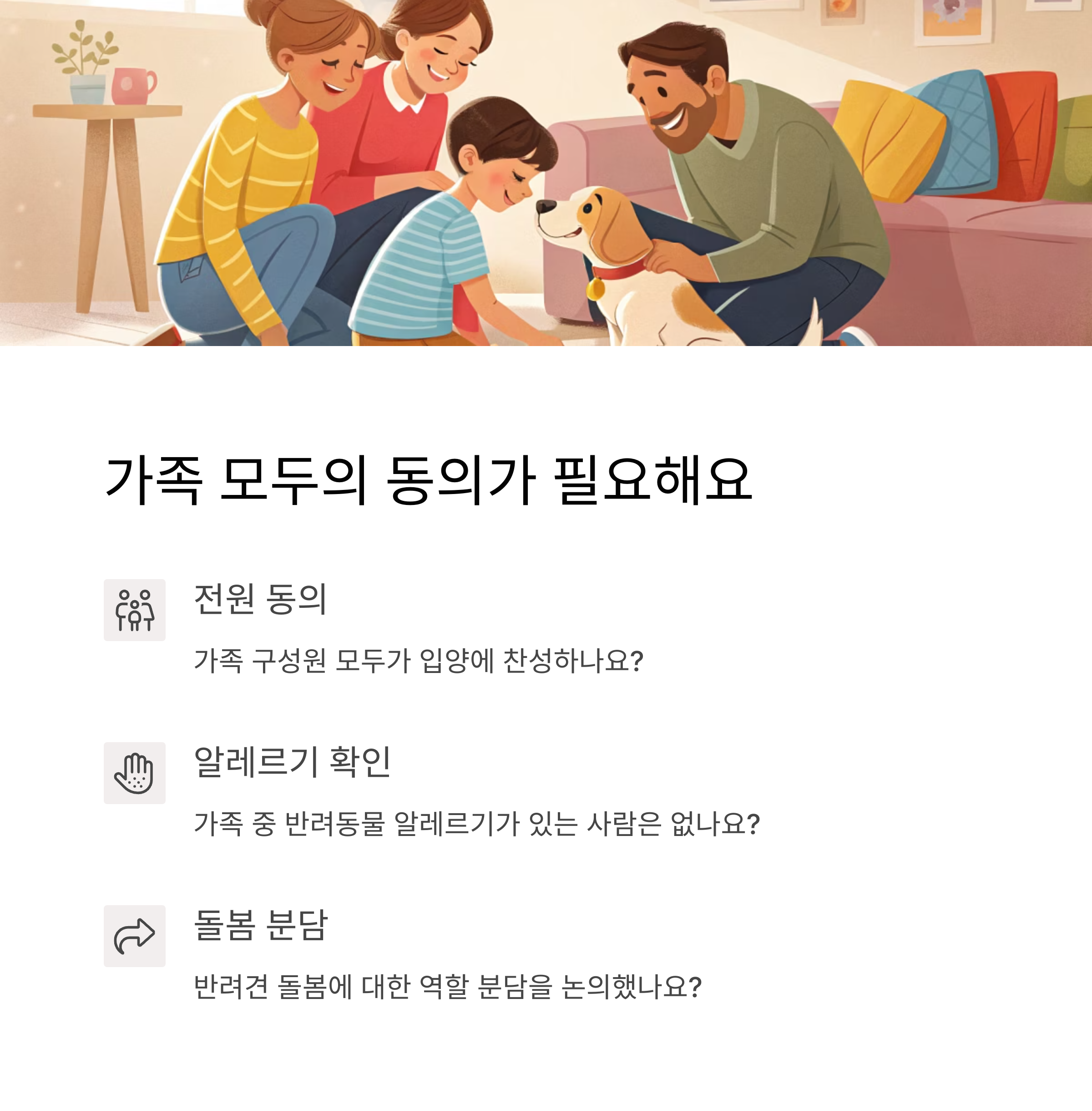 | 가족의 동의 여부 | 가족 모두가 반려견을 맞이할 준비가 되어 있어야 합니다. |