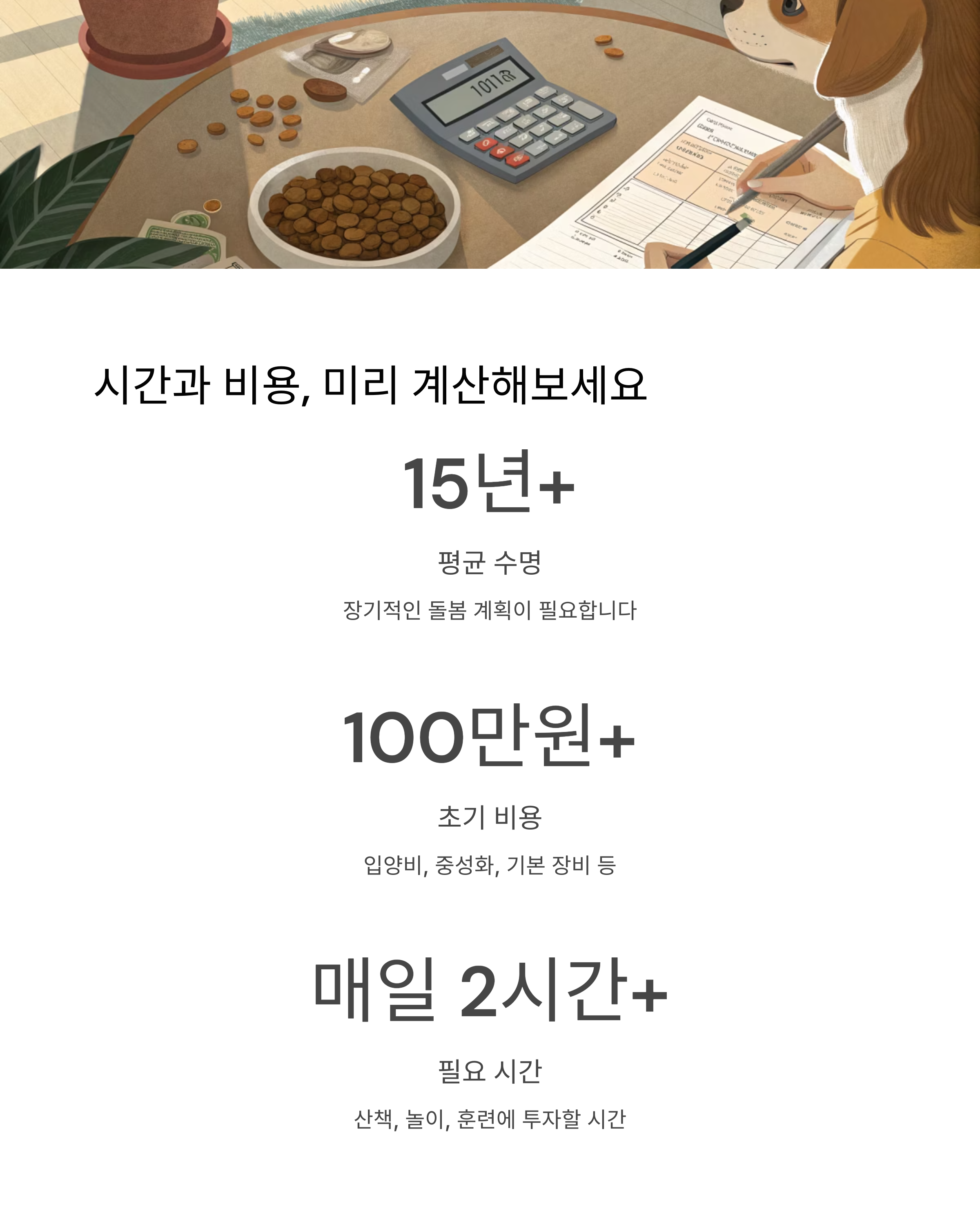 | 가족과 충분한 논의 필요 | 월별 고정비용 확인하기 | 산책과 놀이 시간 확보 |