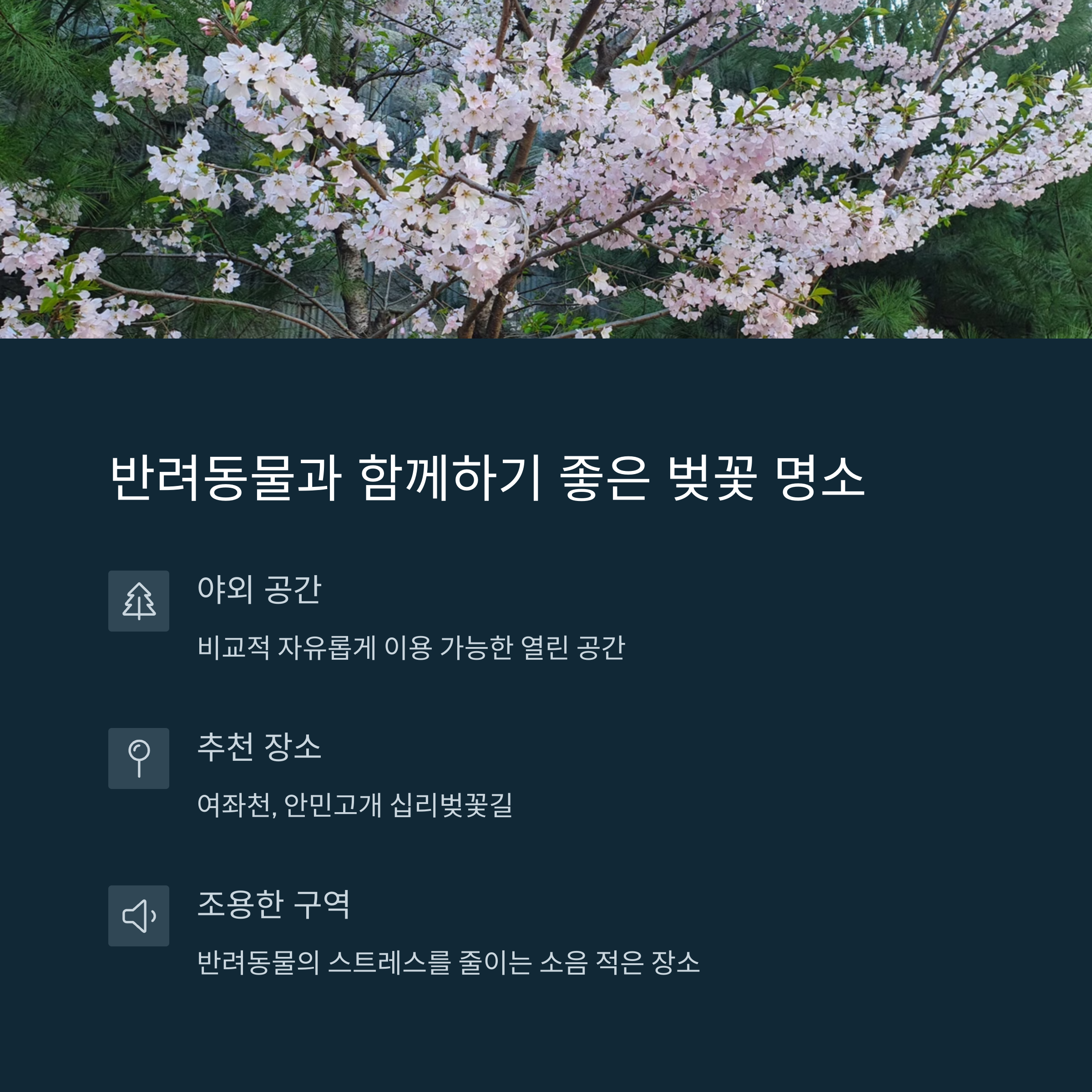 진해 군항제는 매년 수백만 명이 찾는 국내 대표 벚꽃 축제입니다. 여좌천, 경화역, 중원로터리 등 다양한 명소가 조화를 이루며 도시 전체가 벚꽃으로 물드는 화려한 풍경을 자랑합니다. 이러한 대규모 행사에 반려동물을 동반하려는 보호자분들이 점점 많아지고 있지만, 모두에게 열린 공간은 아닌 만큼 사전에 명확한 정보 확인이 중요합니다. 특히 인파가 붐비는 시간대나 장소에서는 안전사고가 우려되므로 신중한 접근이 필요합니다.